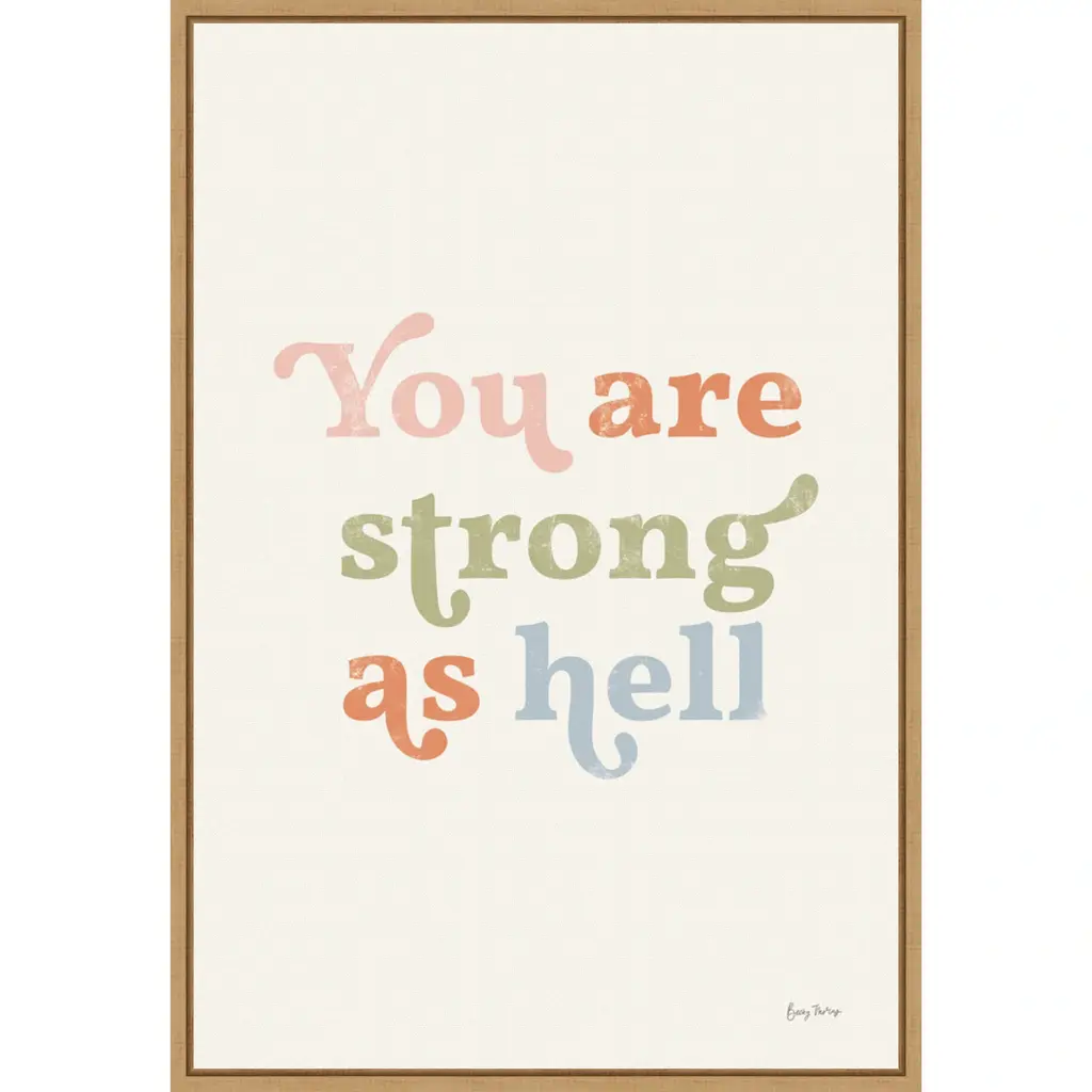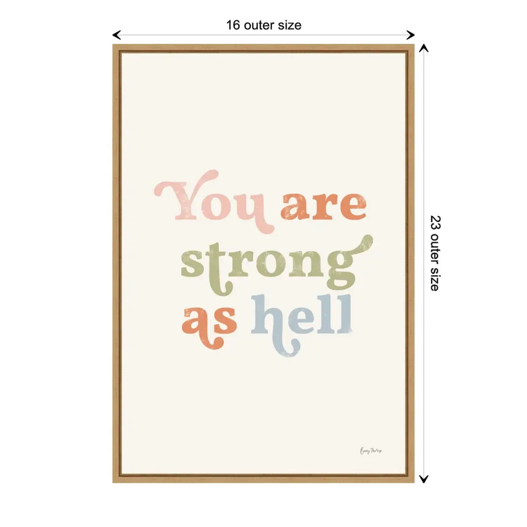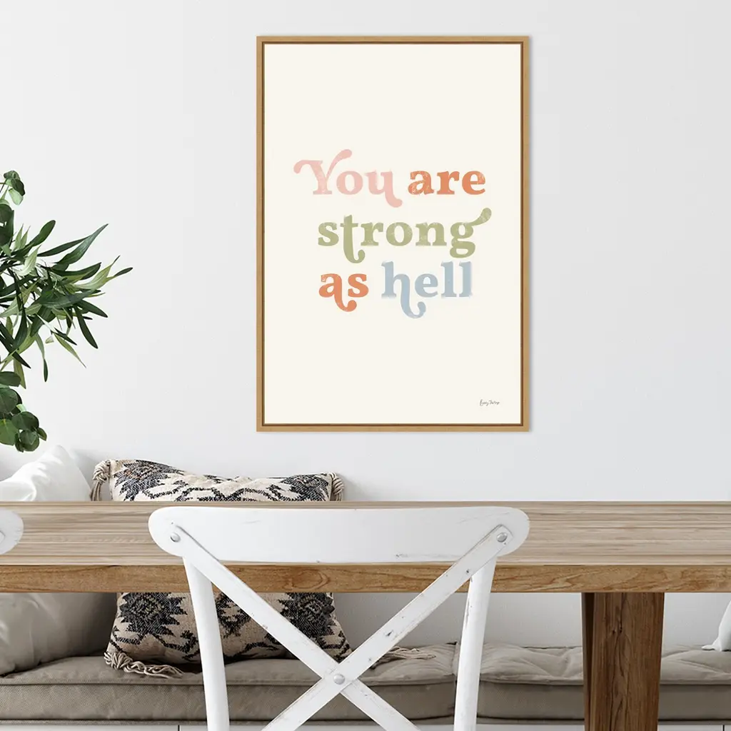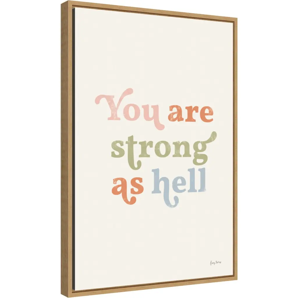 ART DESCRIPTION: Give yourself a daily bold reminder of your inner strength by displaying this colorful piece in your favorite space. With attractive pastels surrounded by a neutral background, this print can offer some introspection in a variety of settings. This Amanti Art canvas art print was created by Becky Thorns and printed by Amanti Art in Madison WI. The canvas is stretched by hand and finished with a float frame. Individually made using traditional custom framing techniques, it has the quality you would expect from your local frame shop. Features: CUSTOM CANVAS ARTWORK DETAILS: You Are Strong Pastel by Becky Thorns. ART DESCRIPTION: Give yourself a daily bold reminder of your inner strength by displaying this colorful piece in your favorite space. With attractive pastels surrounded by a neutral background, this print can offer some introspection in a variety of settings. ARTIST BIO: Becky draws inspiration from the wider joys of life to the smaller things of every day. Working digitally and in watercolor allows her to be able to work anywhere. FRAME DETAILS: The canvas is framed in the Sylvie Maple frame, which is a modern, float frame with natural maple woodgrain coloring and dramatic depth. The frame measures 1 in. wide and stands 2 in. off the wall. The canvas appears as if it is floating in the frame because it has a narrow gap between the edge of the canvas and the frame. The overall size of this framed canvas print measures 16 in. W x 23 in. H. QUALITY AND AUTHENTICITY: Canvas is printed with high-quality, fade-resistant inks for picture-perfect detail and incredible depth of color. Canvas is stretched across a solid surface to resist sagging. We use only premium, high-tension canvas. Our exclusive stretching techniques hide corner folds and provide a taut canvas surface. The artwork is authentically licensed. HASSLE-FREE HANGING: Ready to hang for easy installation. ASSEMBLED IN THE USA: Each piece is assembled to order in Madison, WI USA. FOR HOME OR COMMERCIAL USE: Because of our attention to detail and focus on artistry, architects, interior designers, and homeowners alike choose this framed canvas artwork to create beautiful living spaces.