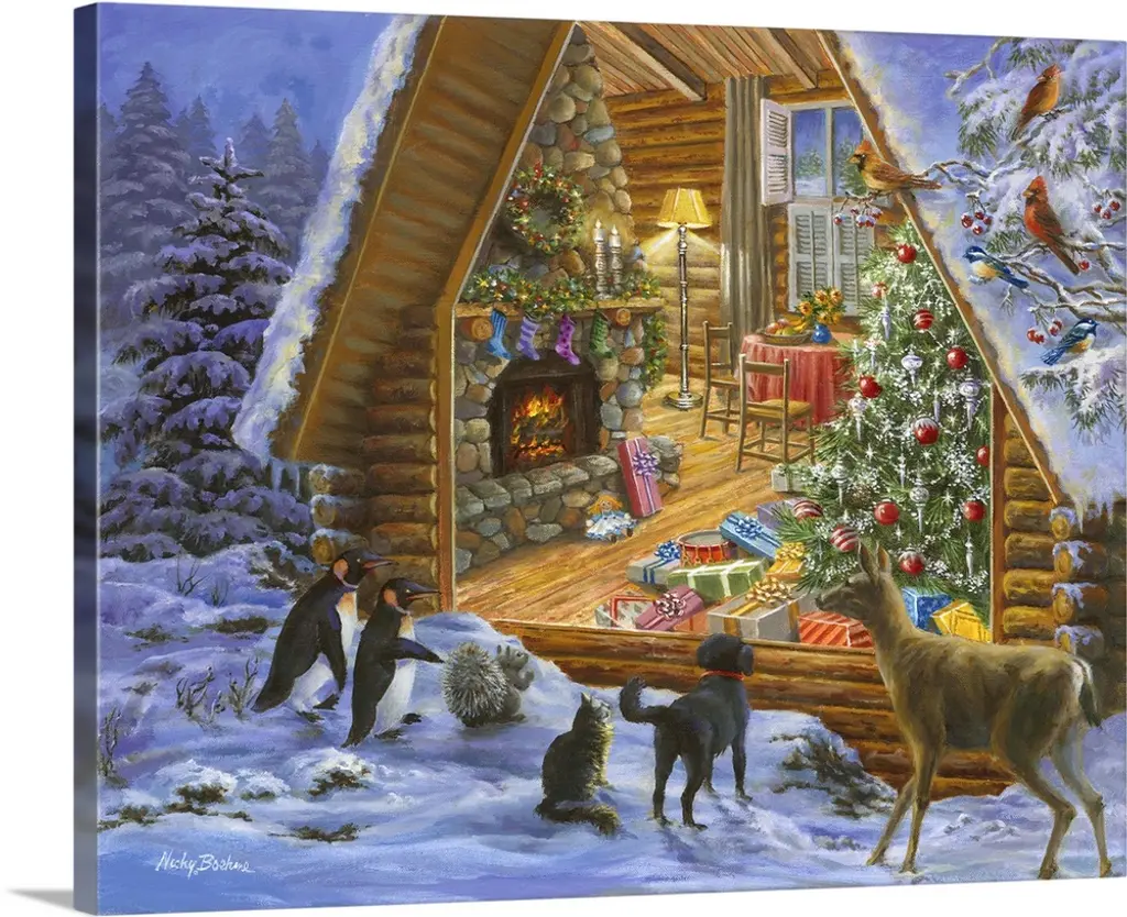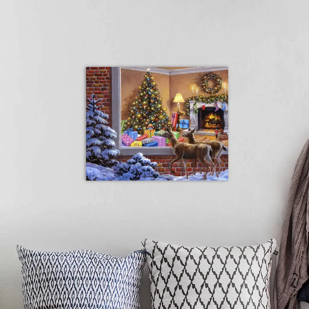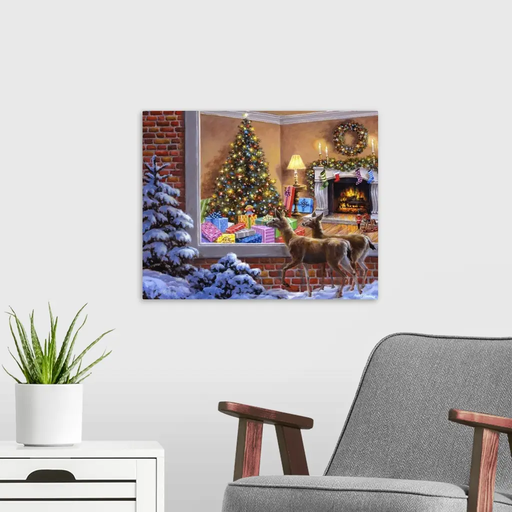 Painting of an indoor scene featuring a large Christmas tree. Product is a painting reproduction only, and does not contain actual lights.
