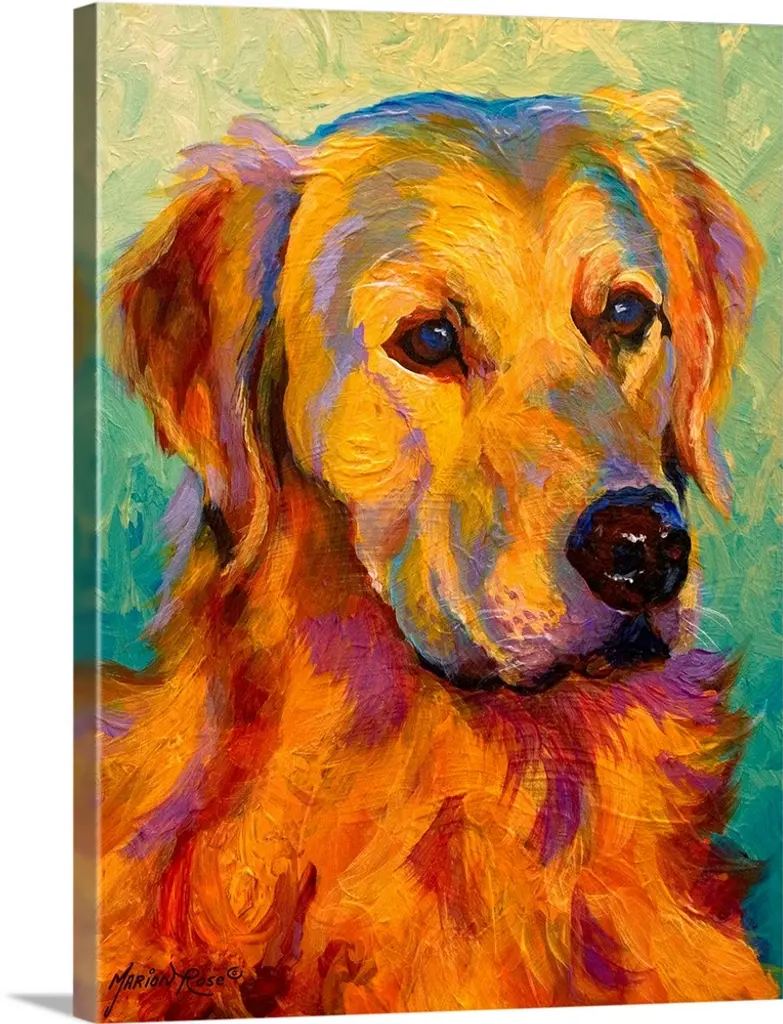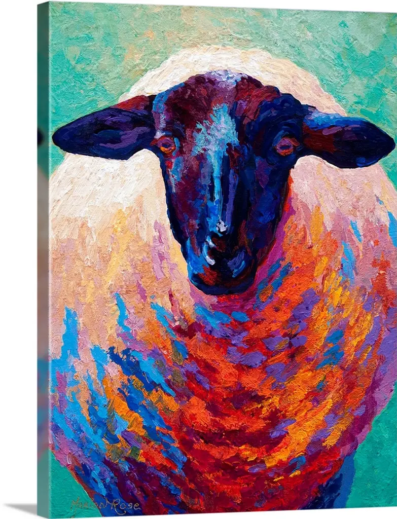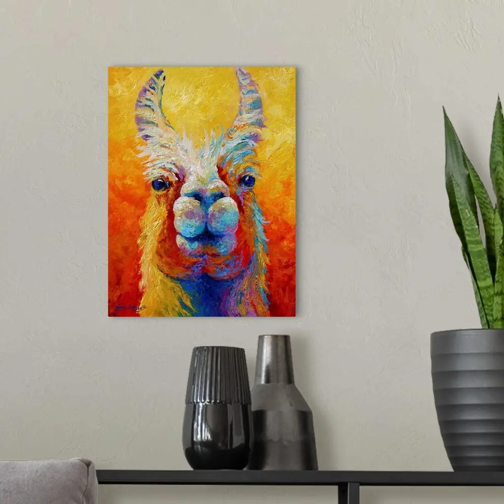 Colorful painting looking straight on at the face of a llama with his ears sticking straight up.