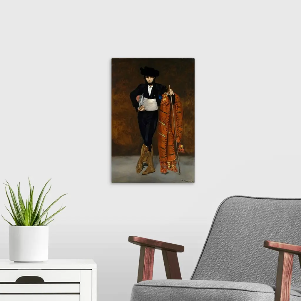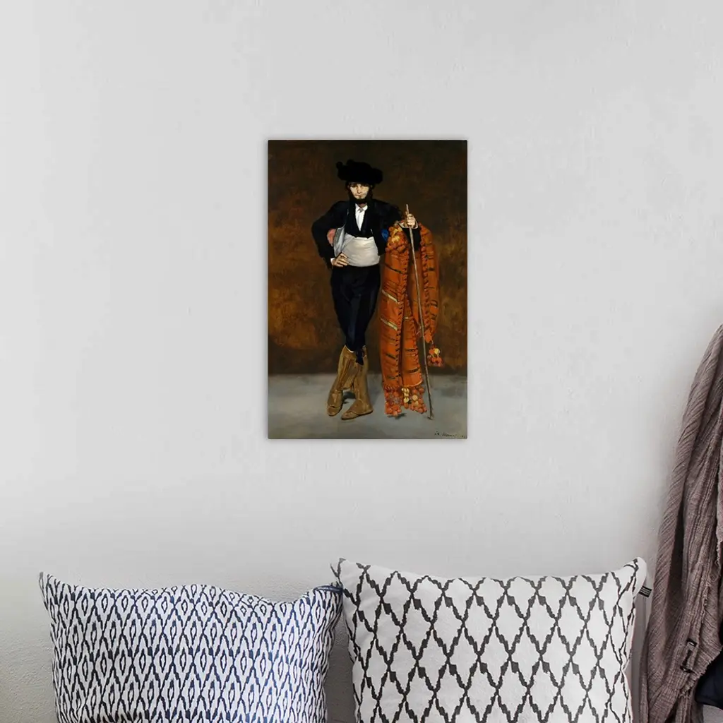 For this image of one of the dashing young Spaniards known as majos, Manet's younger brother Gustave donned the same trousers and bolero jacket worn by model Victorine Meurent in Mademoiselle V... in the Costume of an Espada. Rejected from the Salon of 1863, both paintings were included in the Salon des Refuses that same year. Manet's robust brushwork and bold color were admired by most critics, but some complained that the majo lacked psychological characterization, the artist having rendered his face and hands with no more attention than the details of his costume.