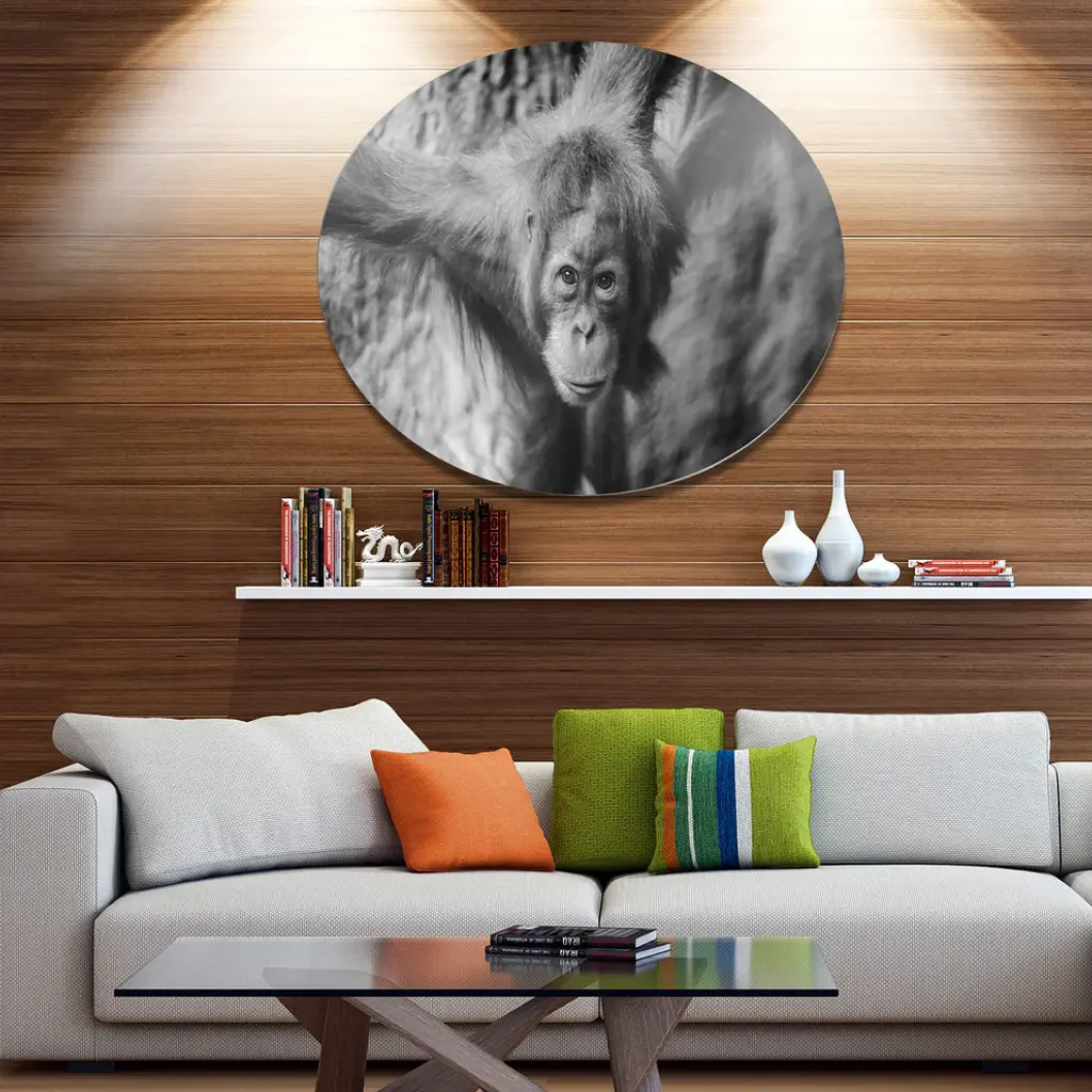 Bring Contemporary Abstraction to your home with this large Circle Metal wall art. This Young Orangutan Black Metal Artwork makes it the focal point of any room or office. - White Gloss Coating ensures colors are extra vibrant with light reflection.- Aluminum grade Sheet Metal with 1 inch mounting frame on the back giving the illusion that the artwork is floating on the wall..- Mounting Brackets are included along with instructions.- High Quality Digital images are created directly into a glossy aluminum panel producing a stunning and captivating print into the glossy finish of the metal.- Water, Fire and Scratch resistant HD Aluminum panels.- Looks better than any photo paper and guaranteed to last at least 20 years- Easy to clean with a microfiber cloth. Colors are far superior to regular Canvas Art. - Easy to Hang