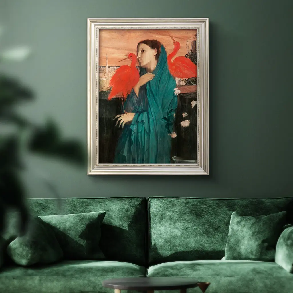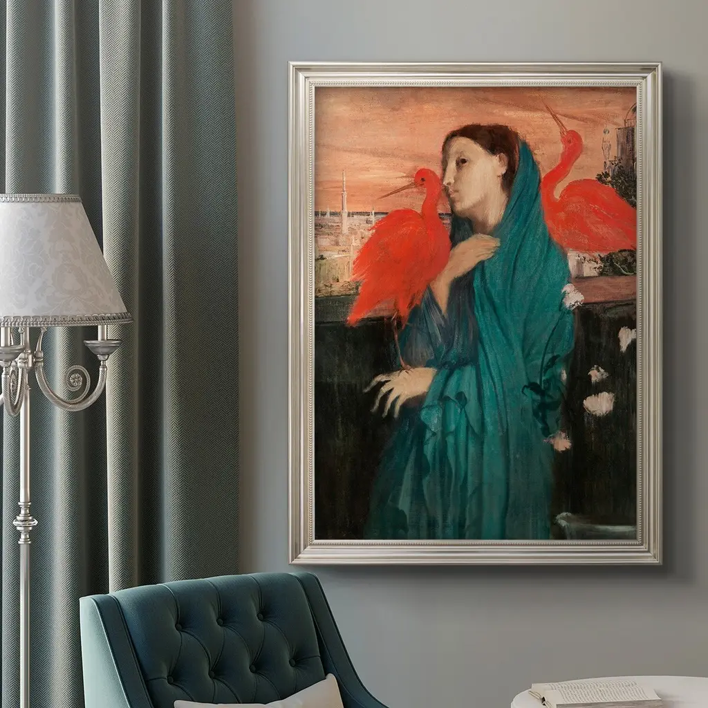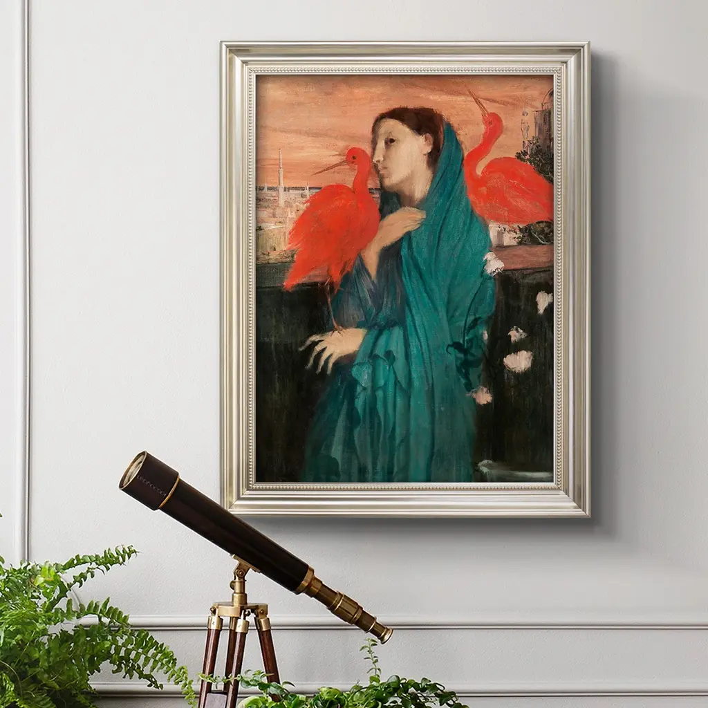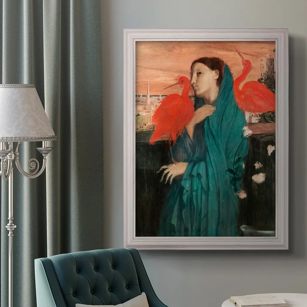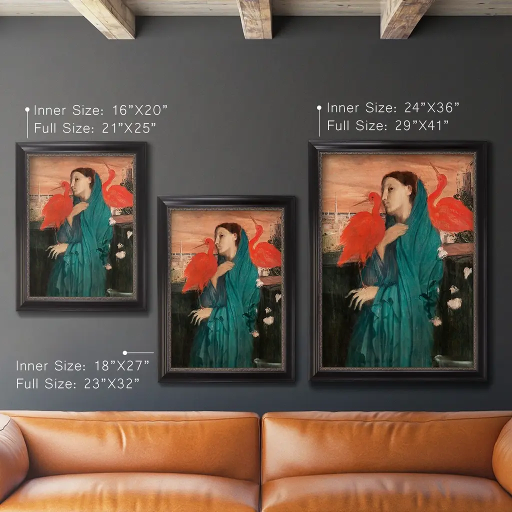 Young Woman with Ibis Premium Framed Canvas- Ready to Hang A Premium Framed Canvas created to last. Framed in distressed wood and available in an array of sizes and colors Featuring a beveled a solid wood stretcher bar, each piece comes ready to hand 3 SIZES AVAILABLE 16''X20'' - Overall Size 18'X27'' - Overall Size 24''x36'' - Overall Size Each piece is made to order. Each piece comes with hanging hardware. Made in the USA Ready to Hang Giclee Paper Print Acrylic Glass Beveled Matt Board
