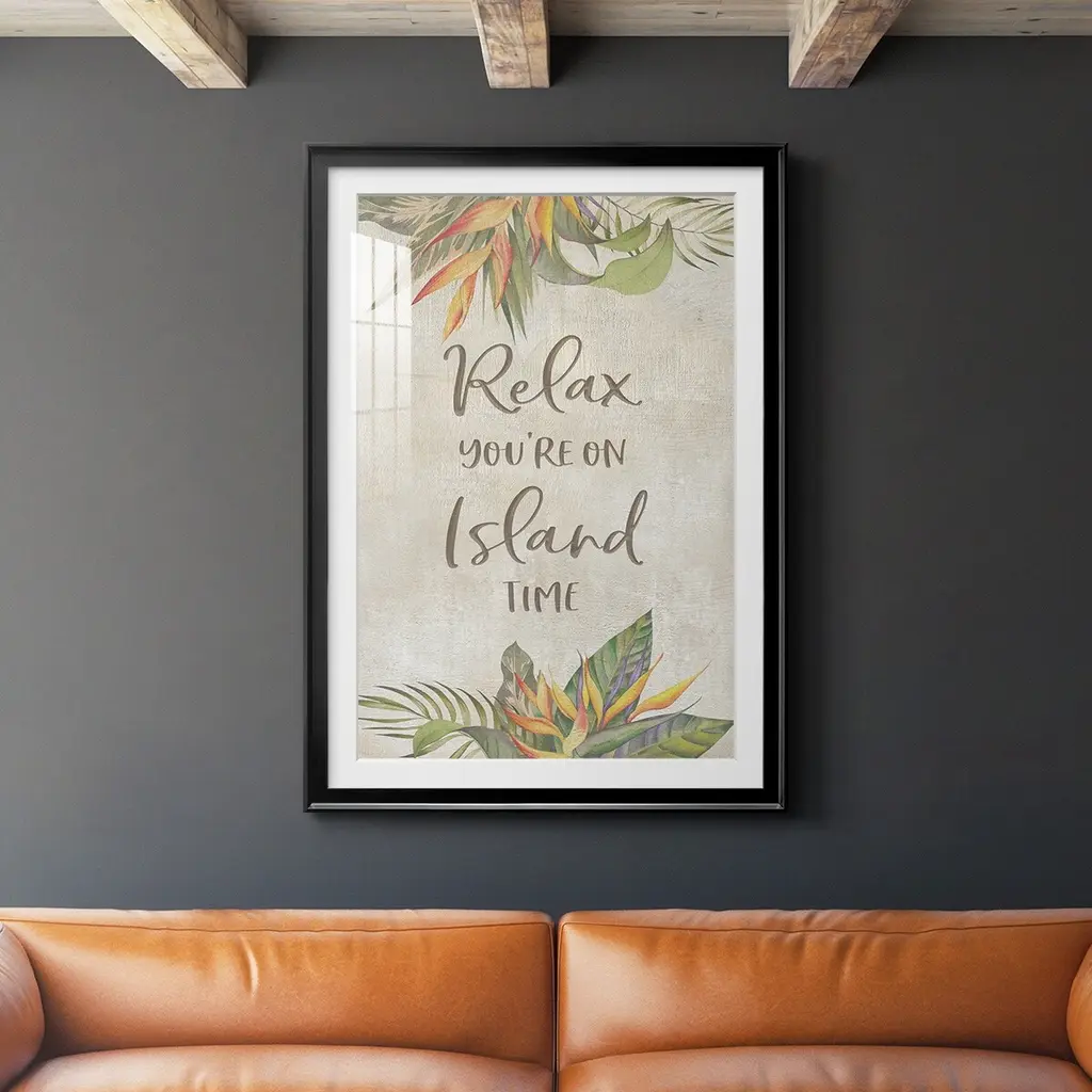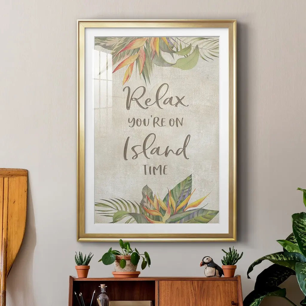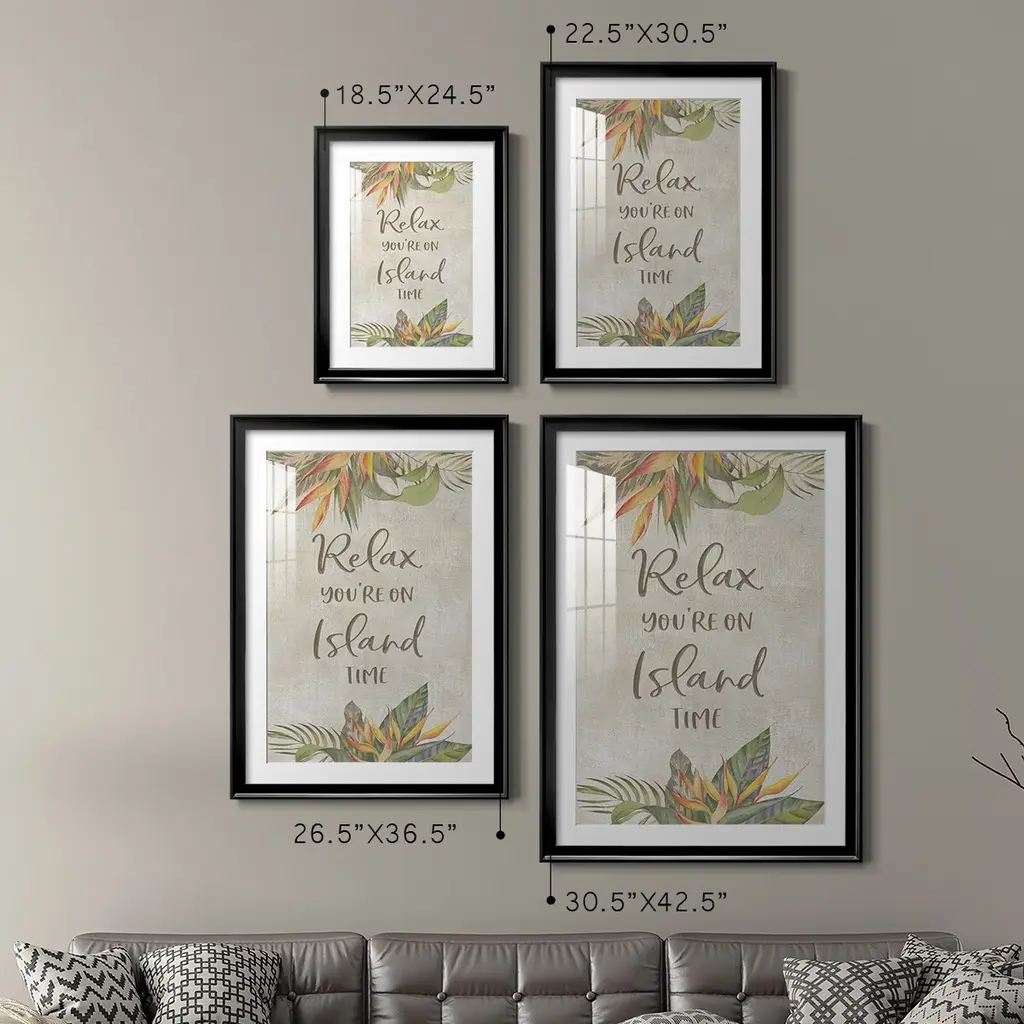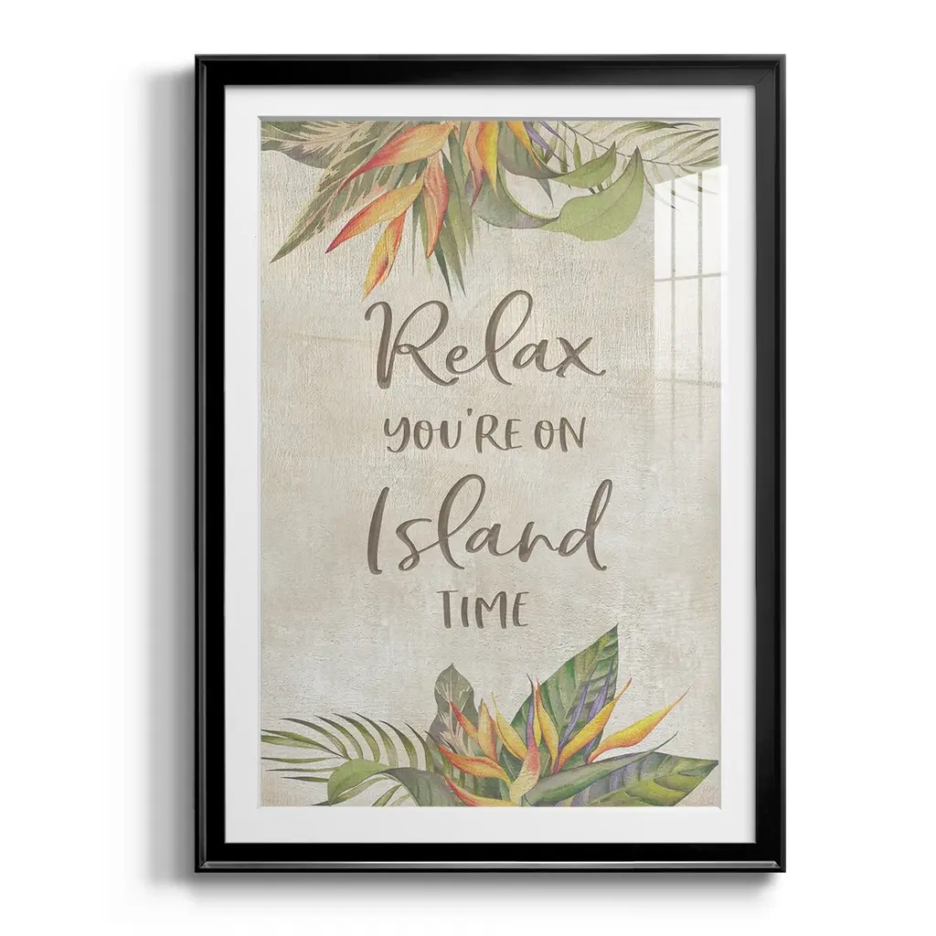 You're On Island Time Premium Framed Print - Ready to Hang A Premium Framed Print created to last. Framed in distressed wood and available in an array of sizes and colors Featuring a beveled a solid wood stretcher bar, each piece comes ready to hand 4 SIZES AVAILABLE 30.5''X42.5'' - Overall Size 26.5'X36.5'' - Overall Size 22.5''x30.5'' - Overall Size 18.5''x24.5'' - Overall Size Each piece is made to order. Each piece comes with hanging hardware. Made in the USA Ready to Hang Giclee Paper Print Acrylic Glass Beveled Matt Board