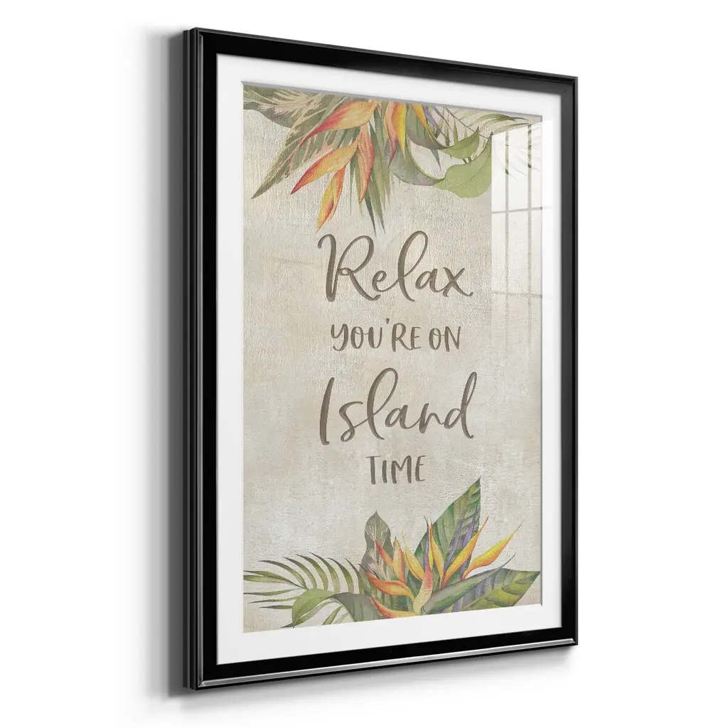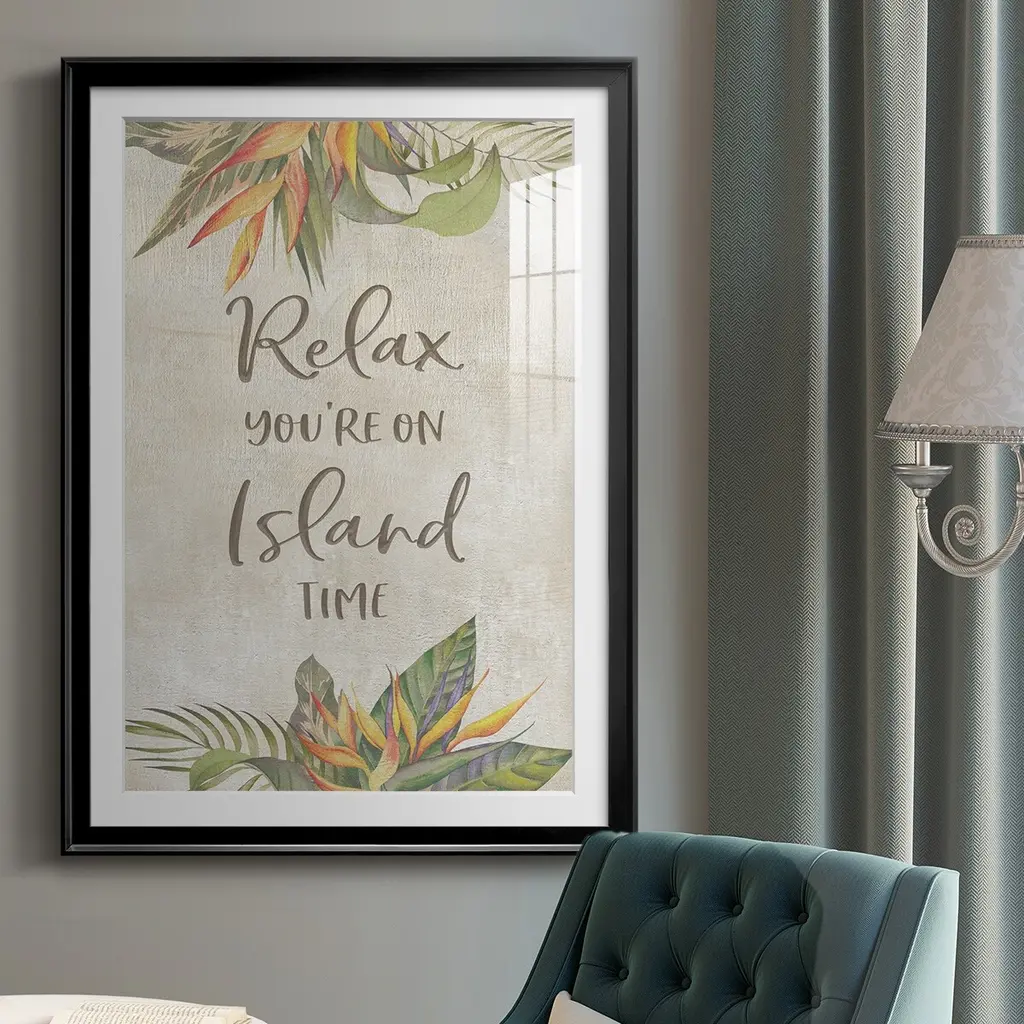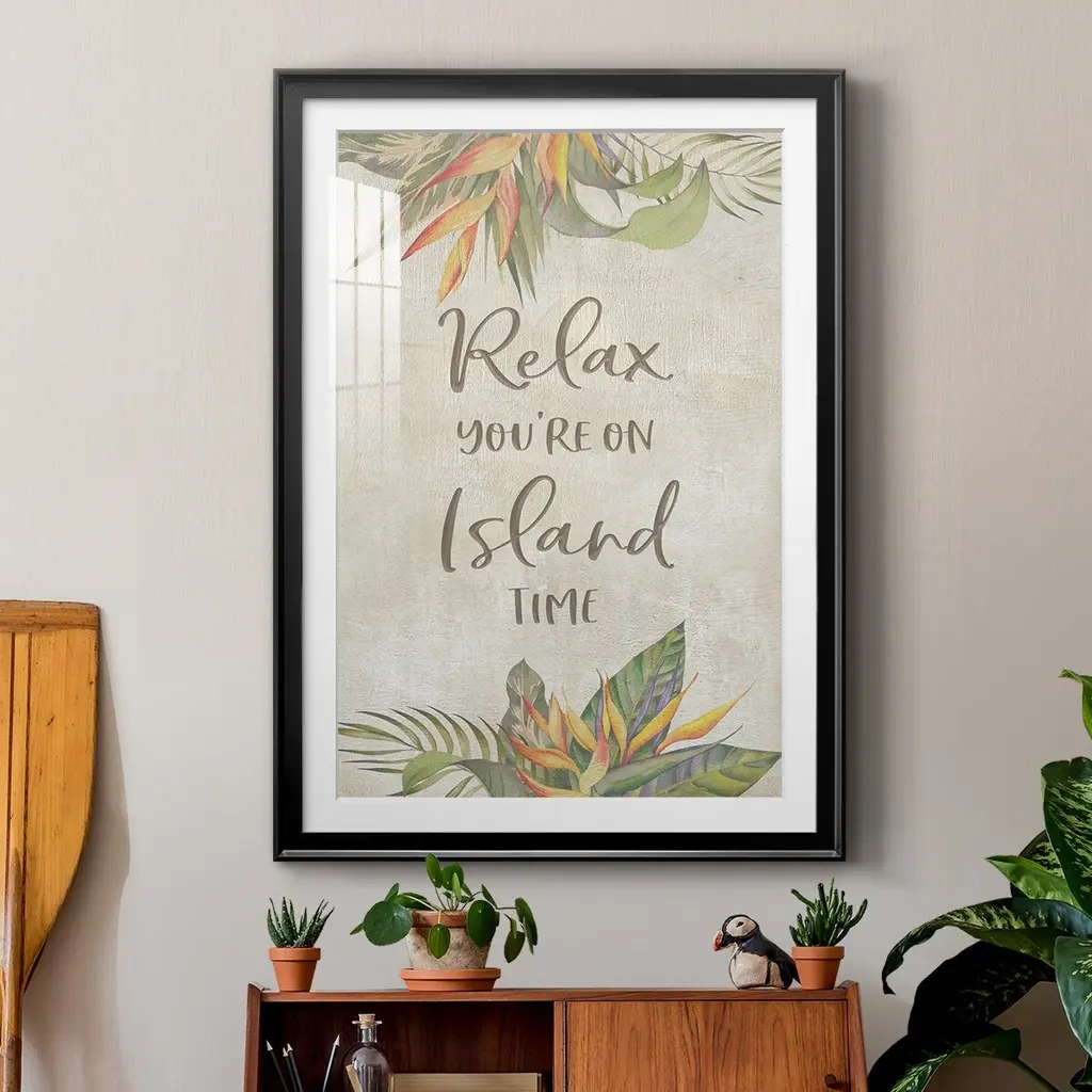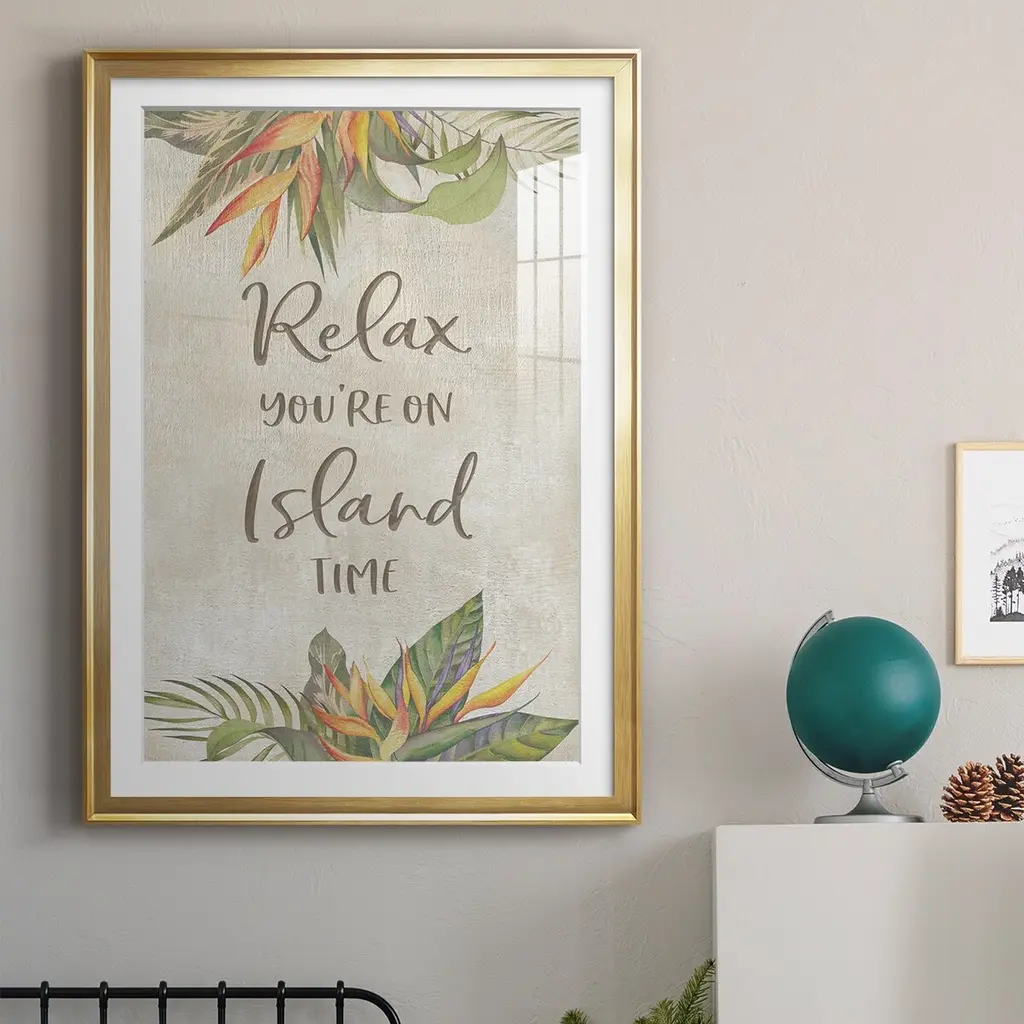 You're On Island Time Premium Framed Print - Ready to Hang A Premium Framed Print created to last. Framed in distressed wood and available in an array of sizes and colors Featuring a beveled a solid wood stretcher bar, each piece comes ready to hand 4 SIZES AVAILABLE 30.5''X42.5'' - Overall Size 26.5'X36.5'' - Overall Size 22.5''x30.5'' - Overall Size 18.5''x24.5'' - Overall Size Each piece is made to order. Each piece comes with hanging hardware. Made in the USA Ready to Hang Giclee Paper Print Acrylic Glass Beveled Matt Board