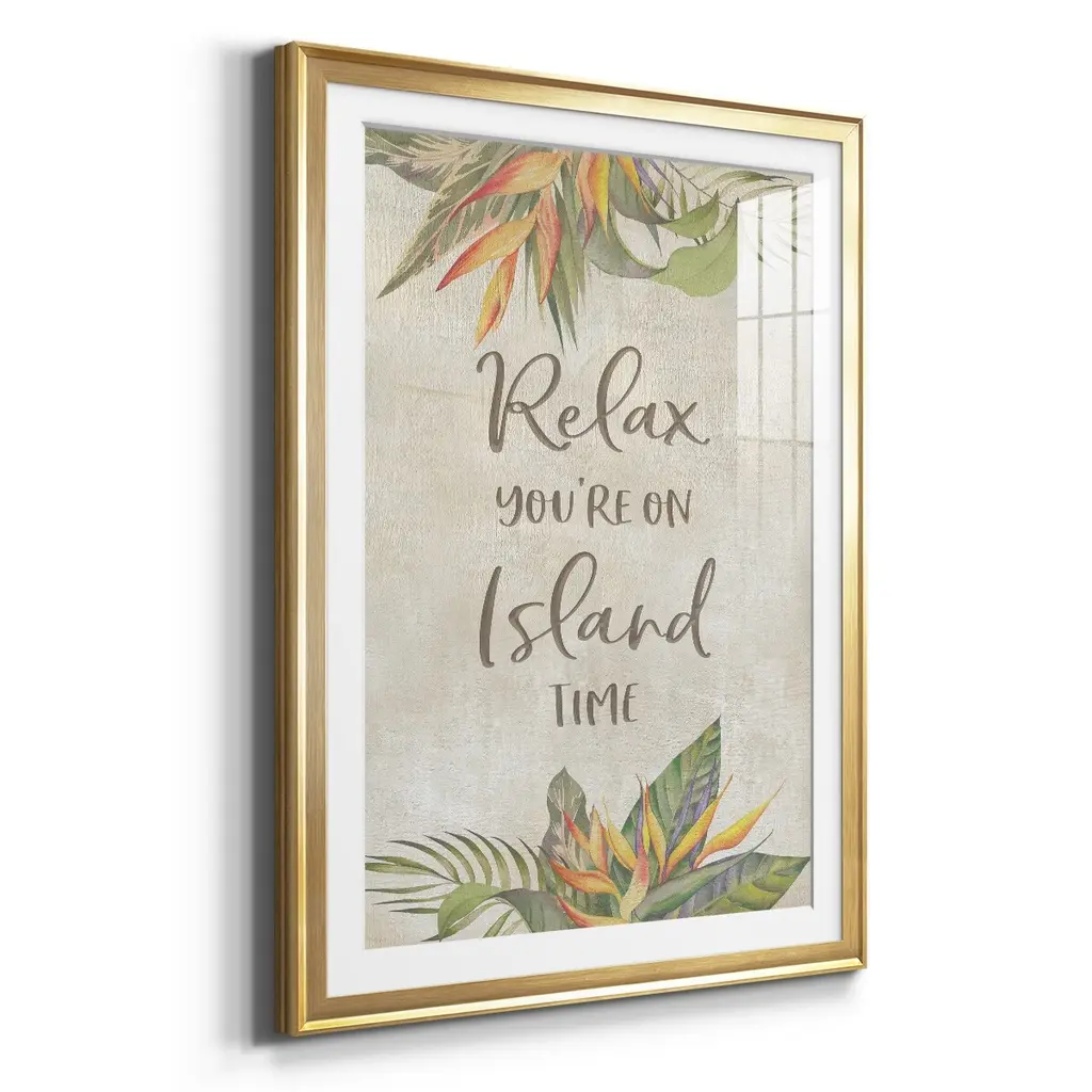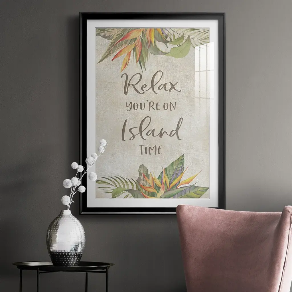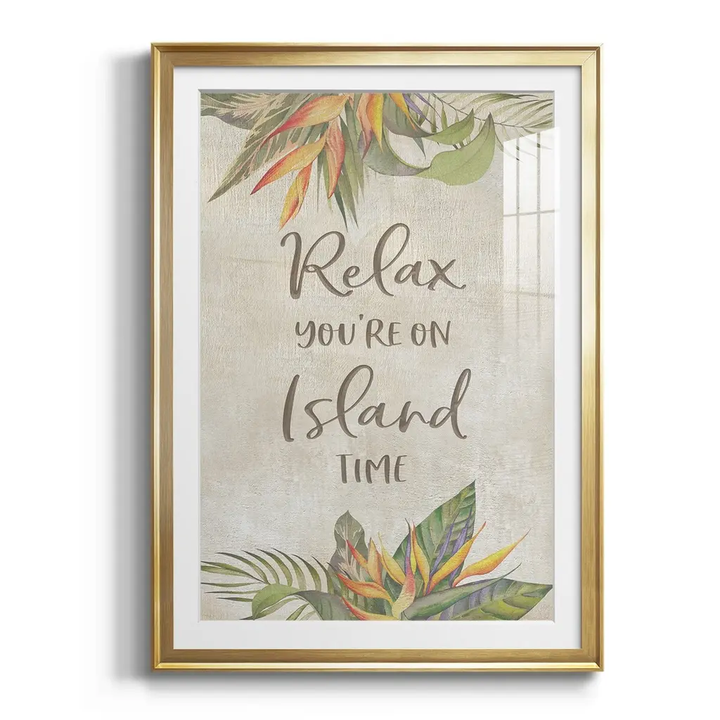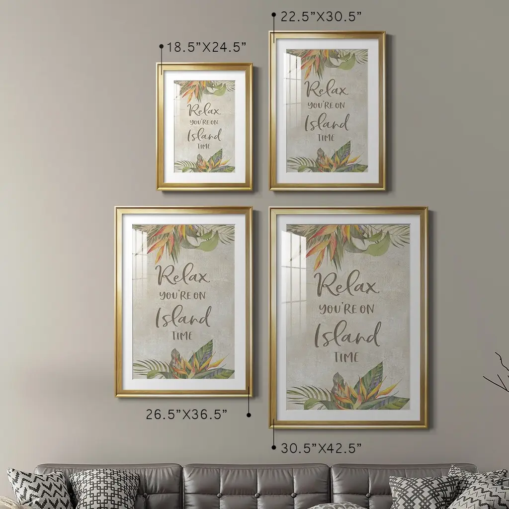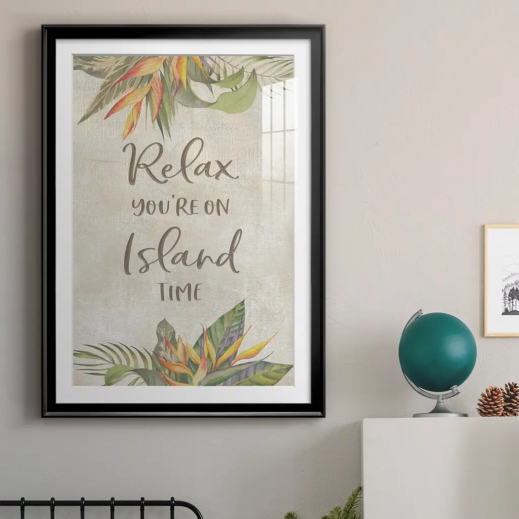 You're On Island Time Premium Framed Print - Ready to Hang A Premium Framed Print created to last. Framed in distressed wood and available in an array of sizes and colors Featuring a beveled a solid wood stretcher bar, each piece comes ready to hand 4 SIZES AVAILABLE 30.5''X42.5'' - Overall Size 26.5'X36.5'' - Overall Size 22.5''x30.5'' - Overall Size 18.5''x24.5'' - Overall Size Each piece is made to order. Each piece comes with hanging hardware. Made in the USA Ready to Hang Giclee Paper Print Acrylic Glass Beveled Matt Board