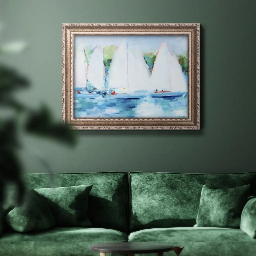 Youth Regatta Premium Framed Canvas- Ready to Hang A Premium Framed Canvas created to last. Framed in distressed wood and available in an array of sizes and colors Featuring a beveled a solid wood stretcher bar, each piece comes ready to hand 3 SIZES AVAILABLE 16''X20'' - Overall Size 18'X27'' - Overall Size 24''x36'' - Overall Size Each piece is made to order. Each piece comes with hanging hardware. Made in the USA Ready to Hang Giclee Paper Print Acrylic Glass Beveled Matt Board