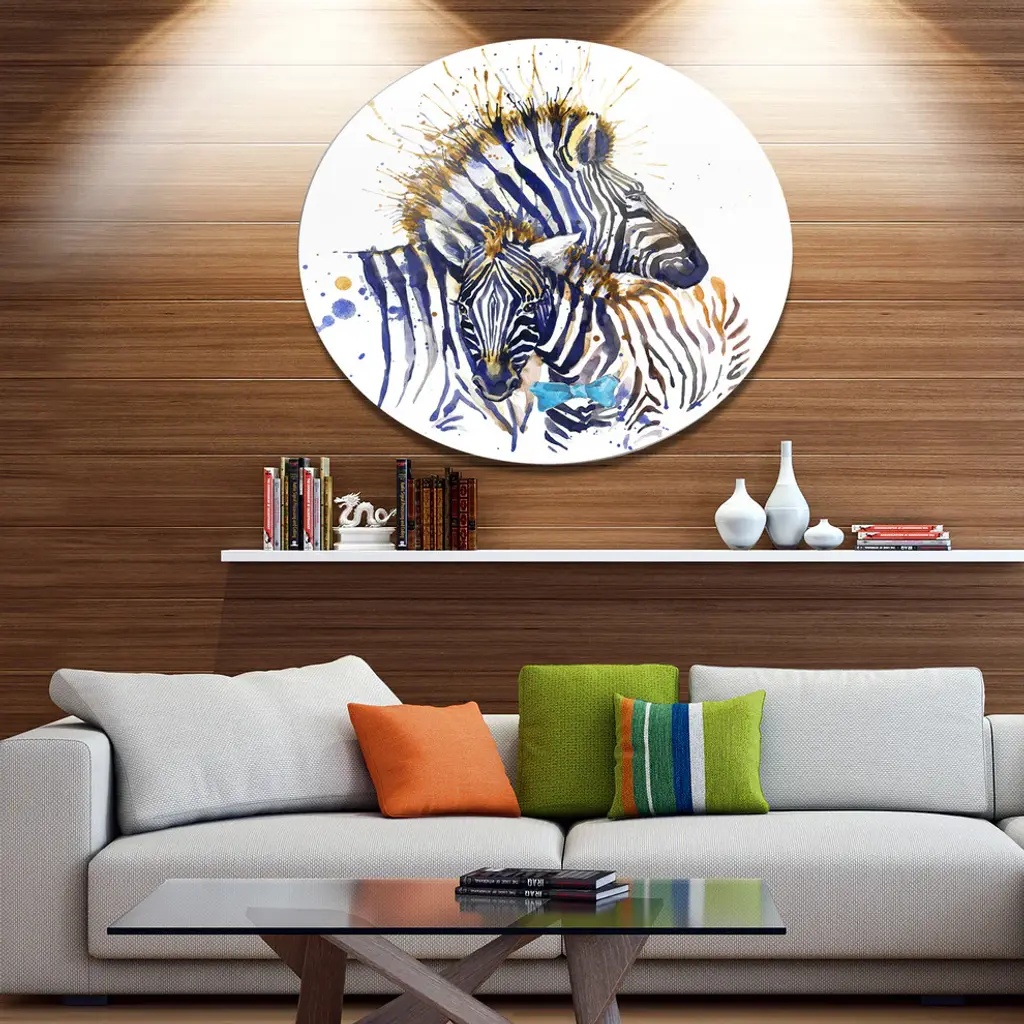Bring Contemporary Abstraction to your home with this large Circle Metal wall art. This Zebra Family Illustration Watercolor Metal Artwork makes it the focal point of any room or office. - White Gloss Coating ensures colors are extra vibrant with light reflection.- Aluminum grade Sheet Metal with 1 inch mounting frame on the back giving the illusion that the artwork is floating on the wall..- Mounting Brackets are included along with instructions.- High Quality Digital images are created directly into a glossy aluminum panel producing a stunning and captivating print into the glossy finish of the metal.- Water, Fire and Scratch resistant HD Aluminum panels.- Looks better than any photo paper and guaranteed to last at least 20 years- Easy to clean with a microfiber cloth. Colors are far superior to regular Canvas Art. - Easy to Hang