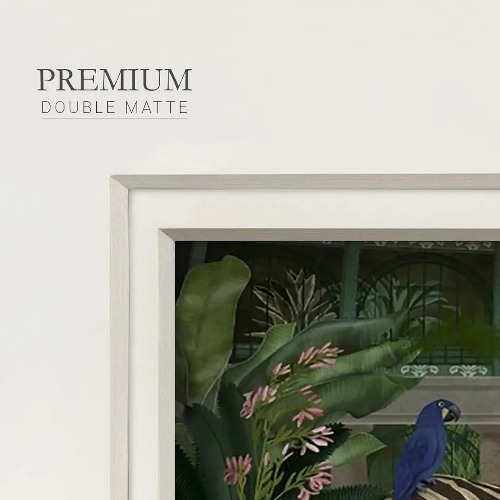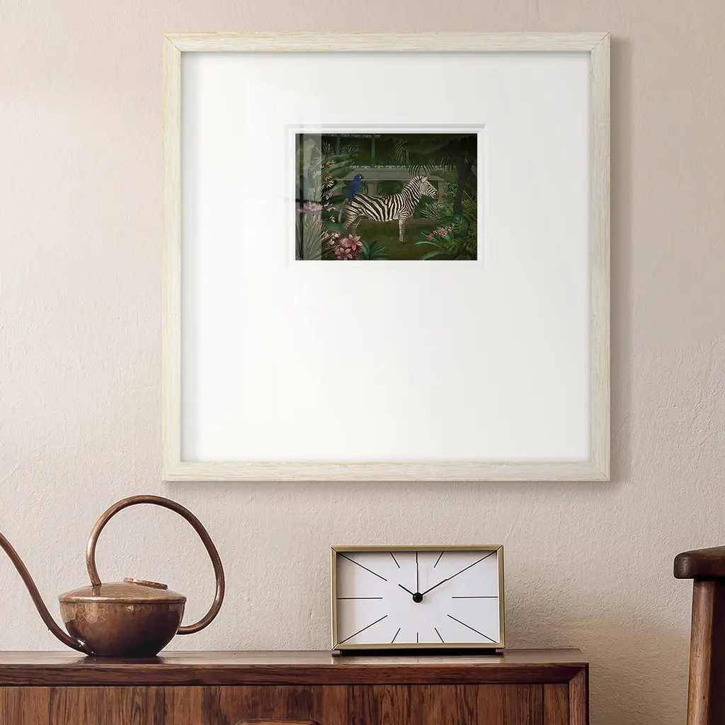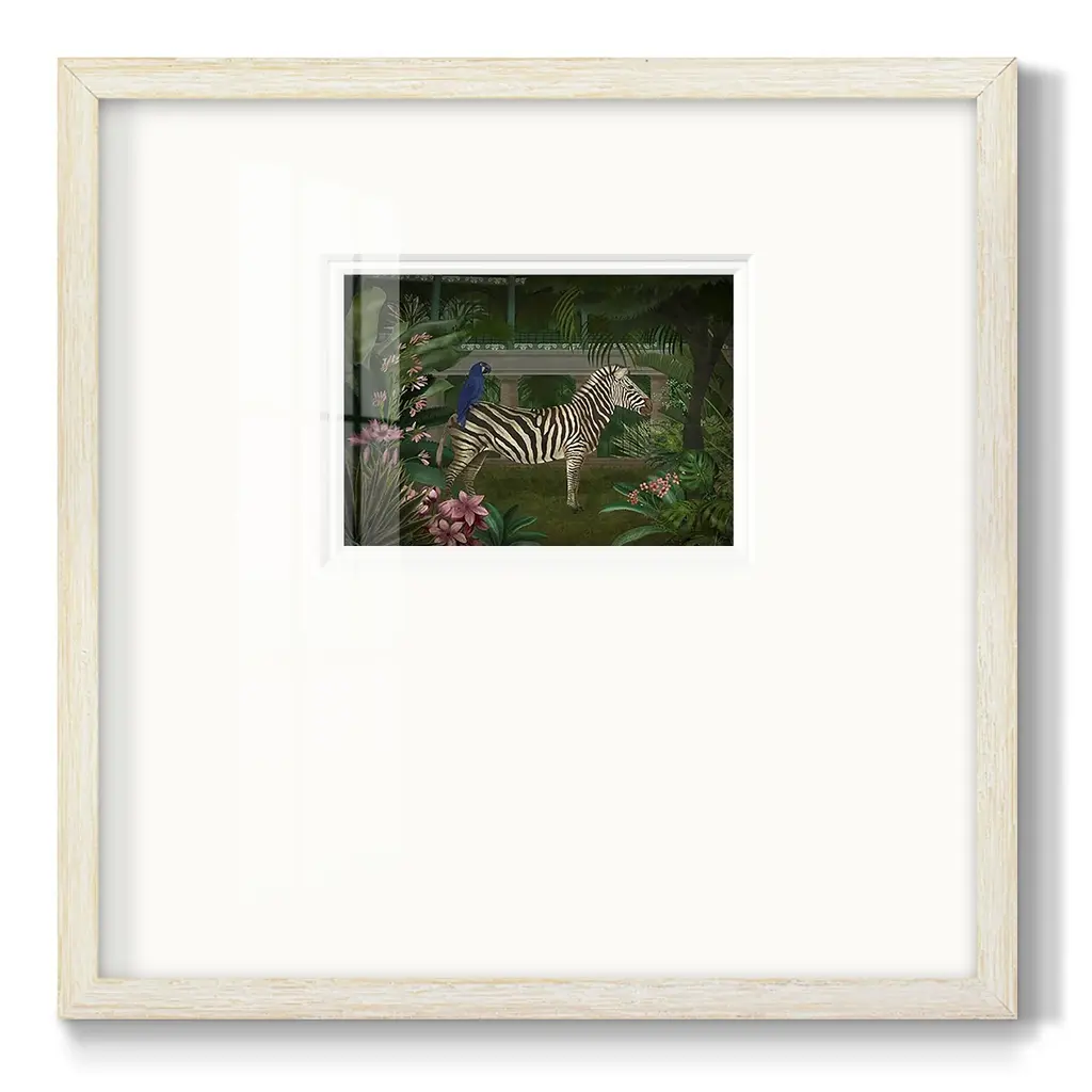 Zebra In ConservatoryPremium Framed Print A framed cold pressed paper print featuring superior double matting and quality frame. 2 SIZES AVAILABLE 16''X16''' - Overall Size 20''X20''' - Overall Size Each piece is made to order. Each piece comes with hanging hardware. Made in the USA Ready to Hang Giclee Paper Print Plexiglass Beveled Matt Board Double Matte Board