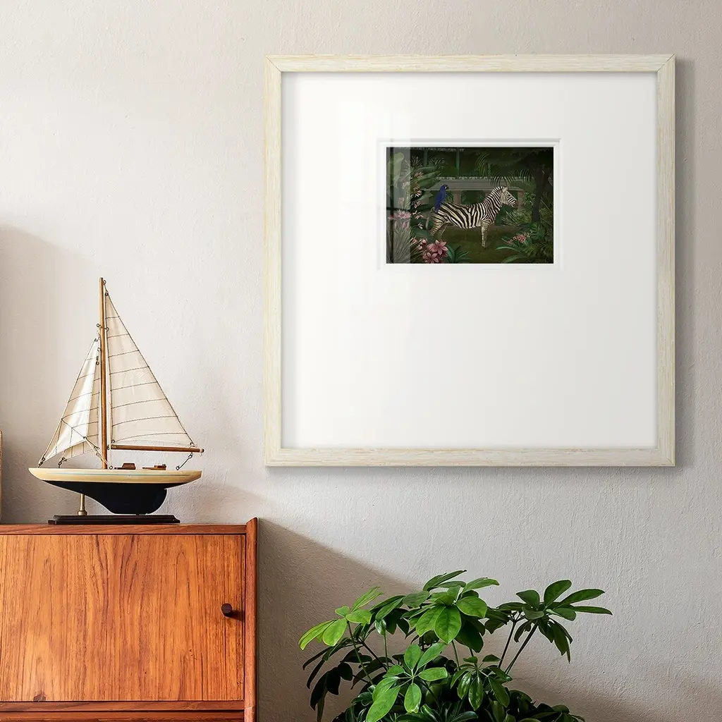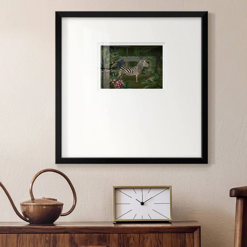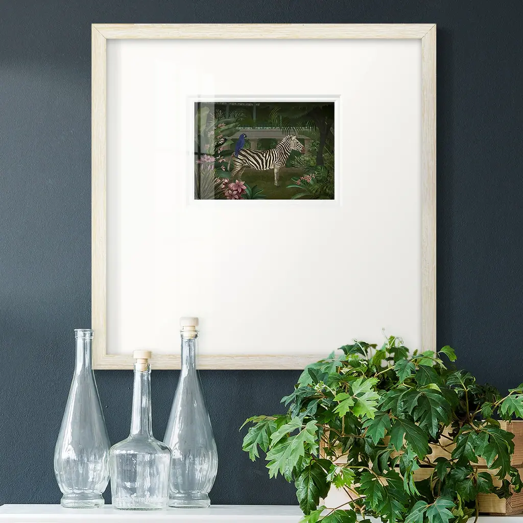 Zebra In ConservatoryPremium Framed Print A framed cold pressed paper print featuring superior double matting and quality frame. 2 SIZES AVAILABLE 16''X16''' - Overall Size 20''X20''' - Overall Size Each piece is made to order. Each piece comes with hanging hardware. Made in the USA Ready to Hang Giclee Paper Print Plexiglass Beveled Matt Board Double Matte Board