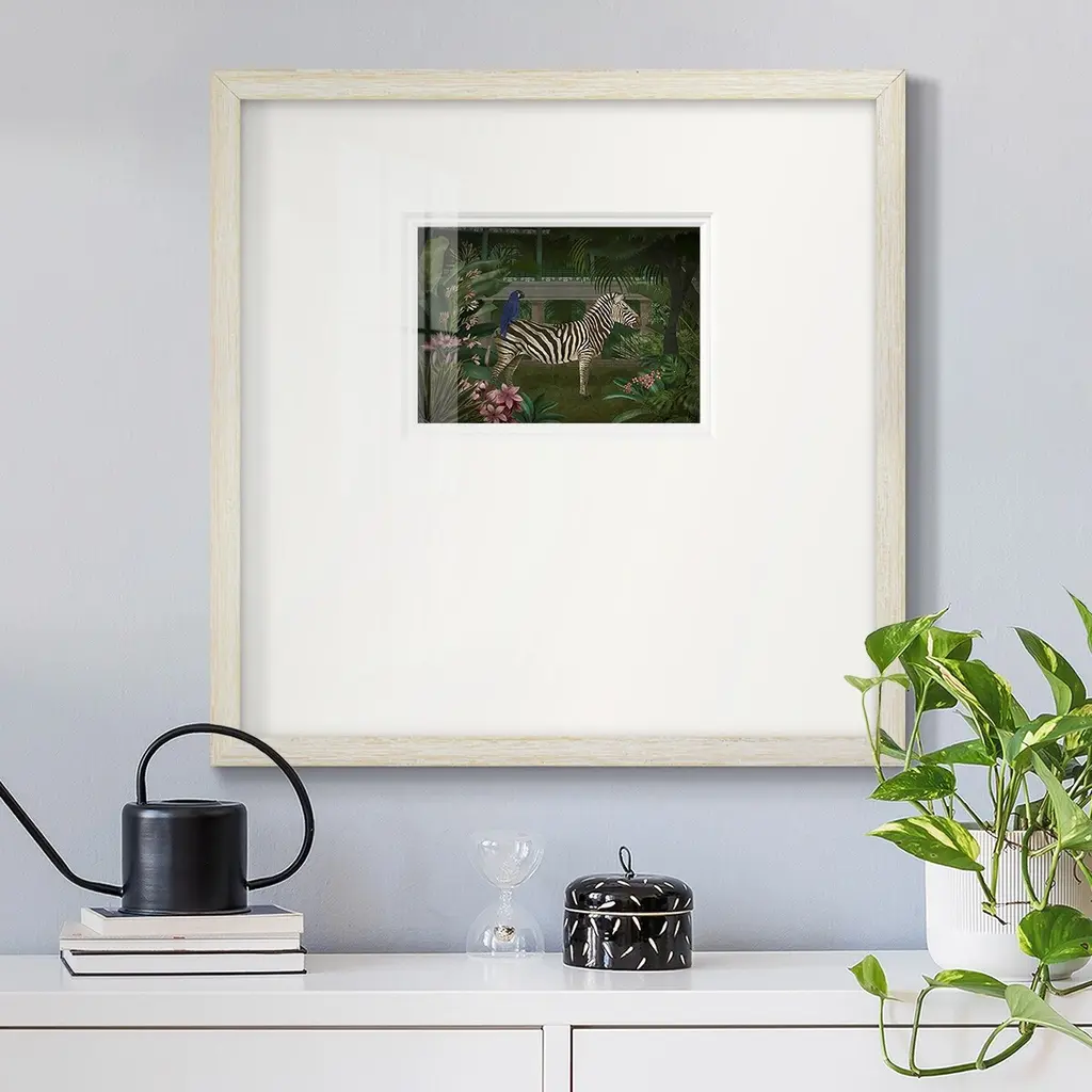 Zebra In ConservatoryPremium Framed Print A framed cold pressed paper print featuring superior double matting and quality frame. 2 SIZES AVAILABLE 16''X16''' - Overall Size 20''X20''' - Overall Size Each piece is made to order. Each piece comes with hanging hardware. Made in the USA Ready to Hang Giclee Paper Print Plexiglass Beveled Matt Board Double Matte Board