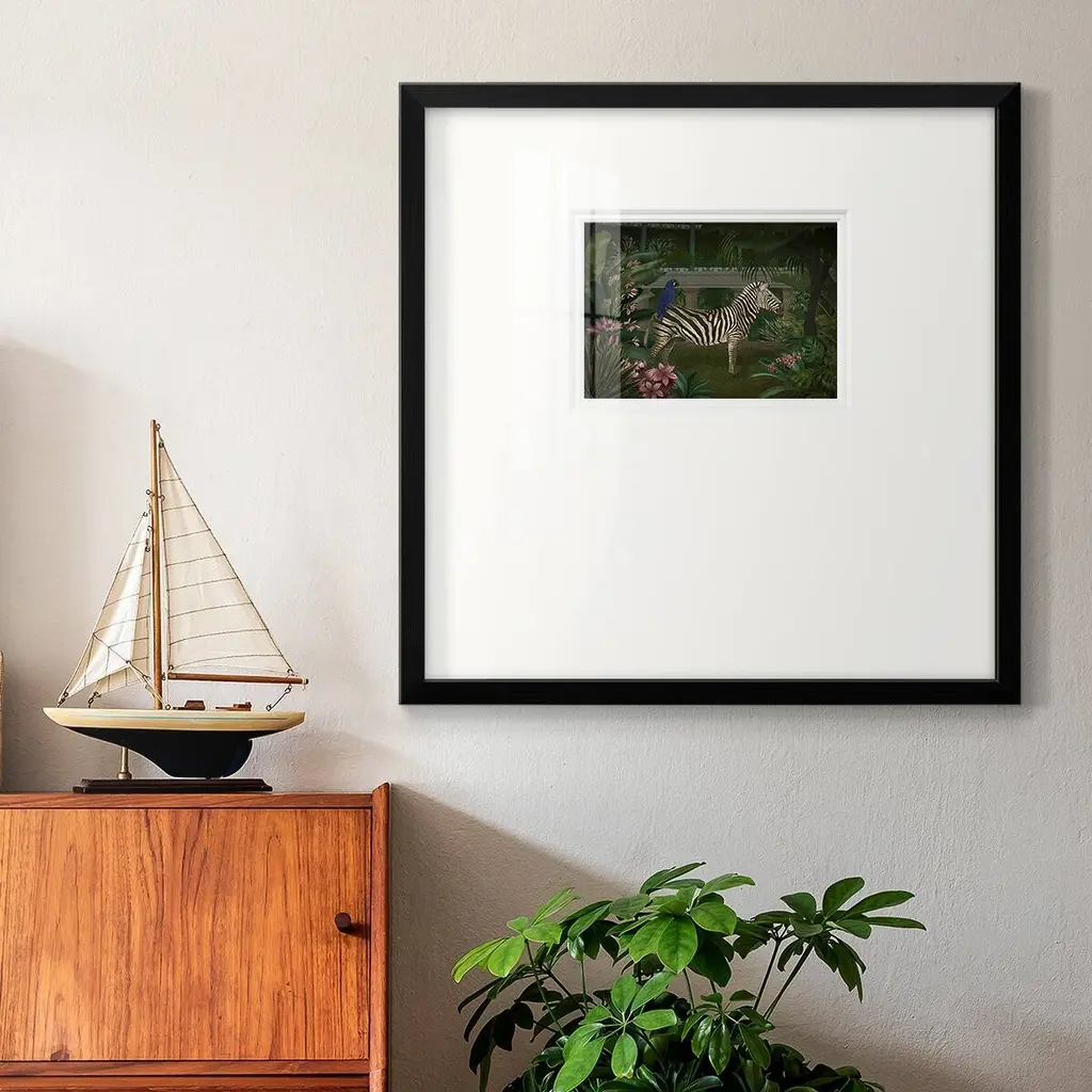 Zebra In ConservatoryPremium Framed Print A framed cold pressed paper print featuring superior double matting and quality frame. 2 SIZES AVAILABLE 16''X16''' - Overall Size 20''X20''' - Overall Size Each piece is made to order. Each piece comes with hanging hardware. Made in the USA Ready to Hang Giclee Paper Print Plexiglass Beveled Matt Board Double Matte Board