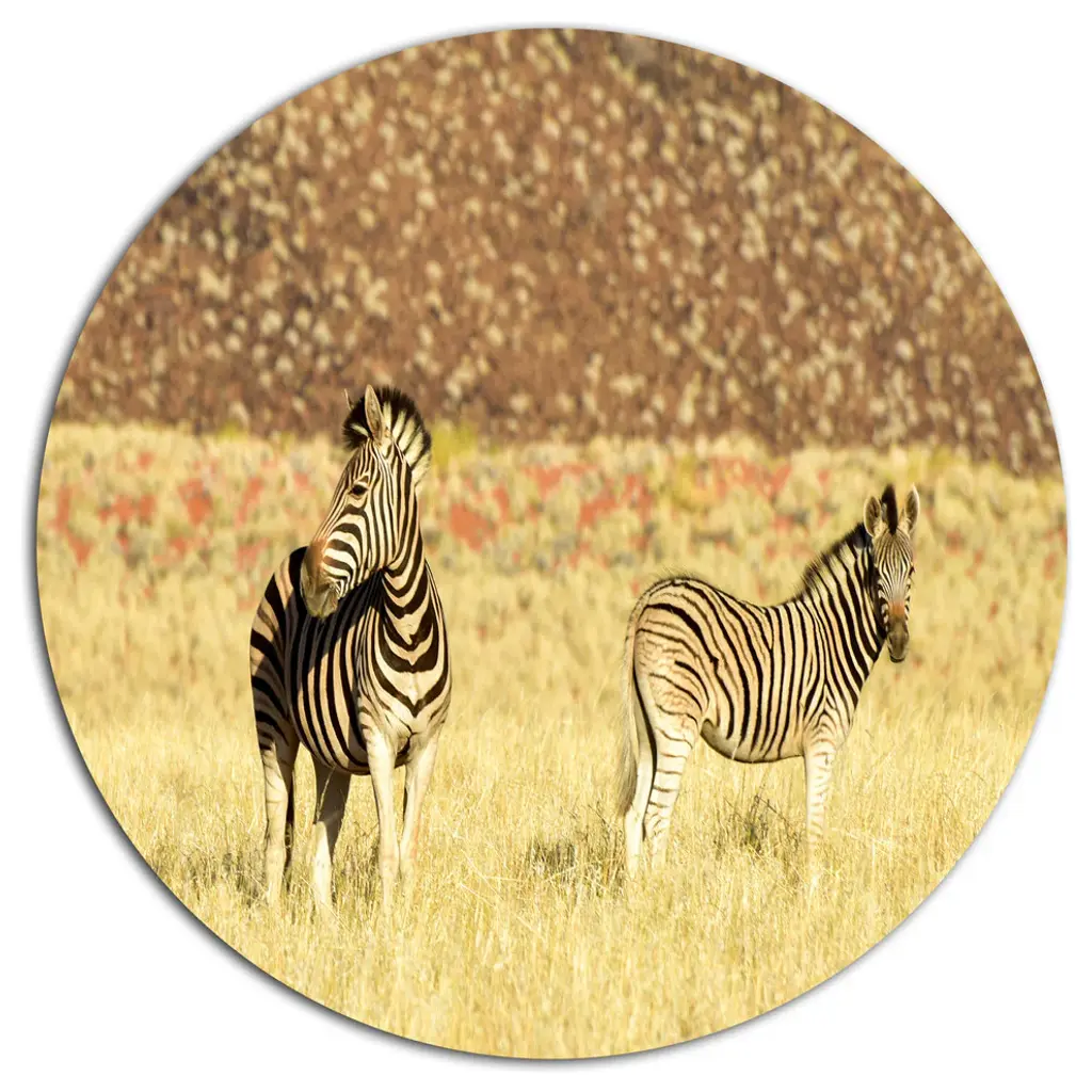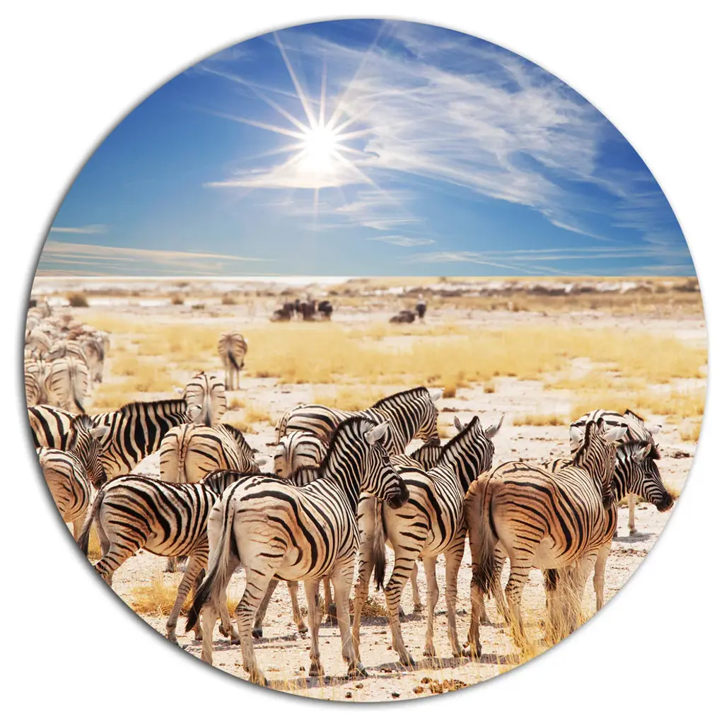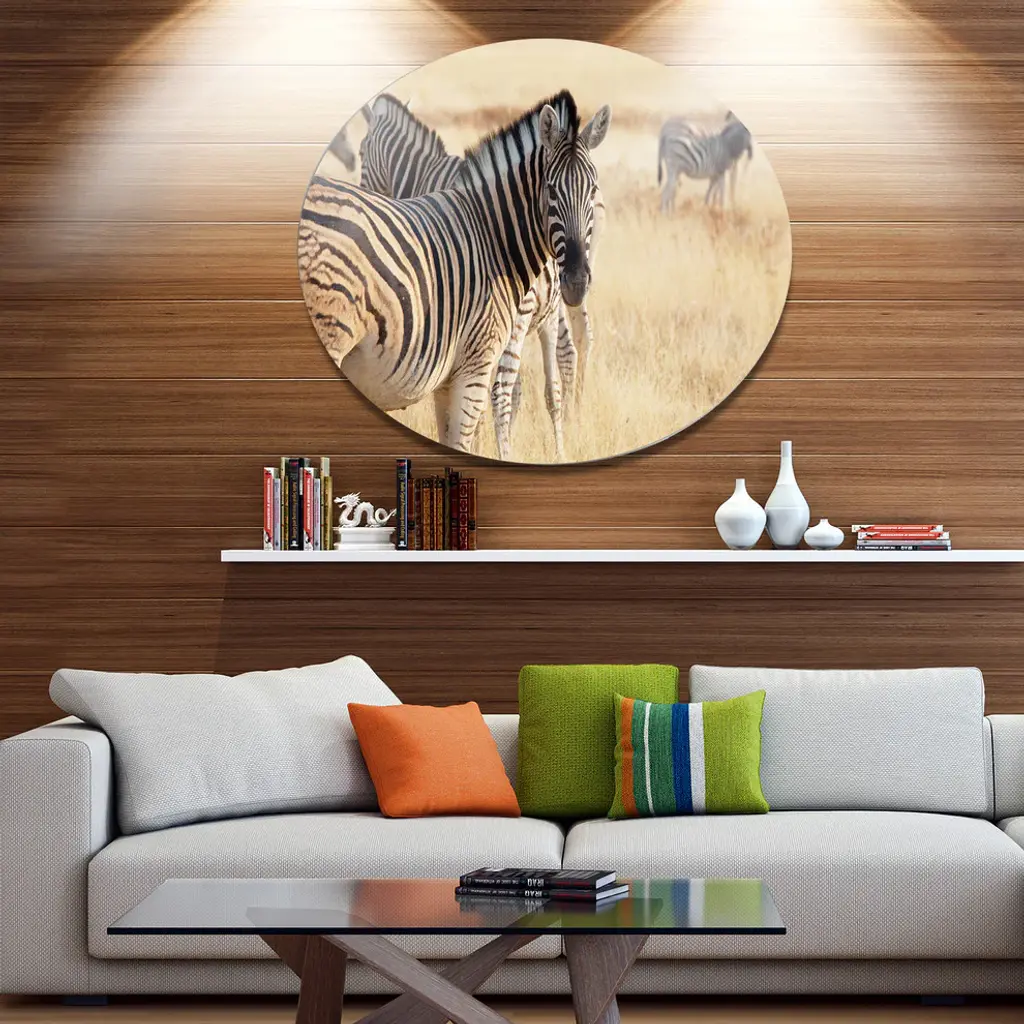 Bring Contemporary Abstraction to your home with this large Circle Metal wall art. This Zebra in Etosha Wandering in Grass Metal Artwork makes it the focal point of any room or office. - White Gloss Coating ensures colors are extra vibrant with light reflection.- Aluminum grade Sheet Metal with 1 inch mounting frame on the back giving the illusion that the artwork is floating on the wall..- Mounting Brackets are included along with instructions.- High Quality Digital images are created directly into a glossy aluminum panel producing a stunning and captivating print into the glossy finish of the metal.- Water, Fire and Scratch resistant HD Aluminum panels.- Looks better than any photo paper and guaranteed to last at least 20 years- Easy to clean with a microfiber cloth. Colors are far superior to regular Canvas Art. - Easy to Hang