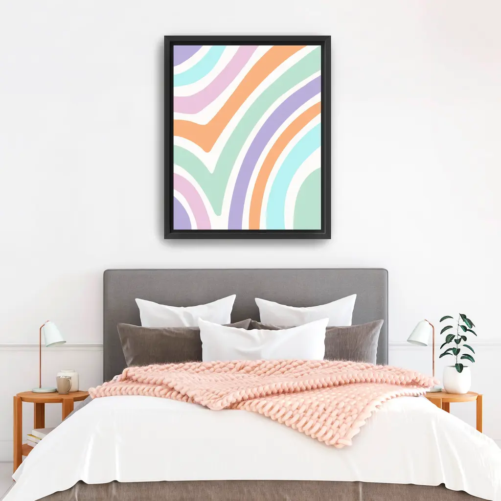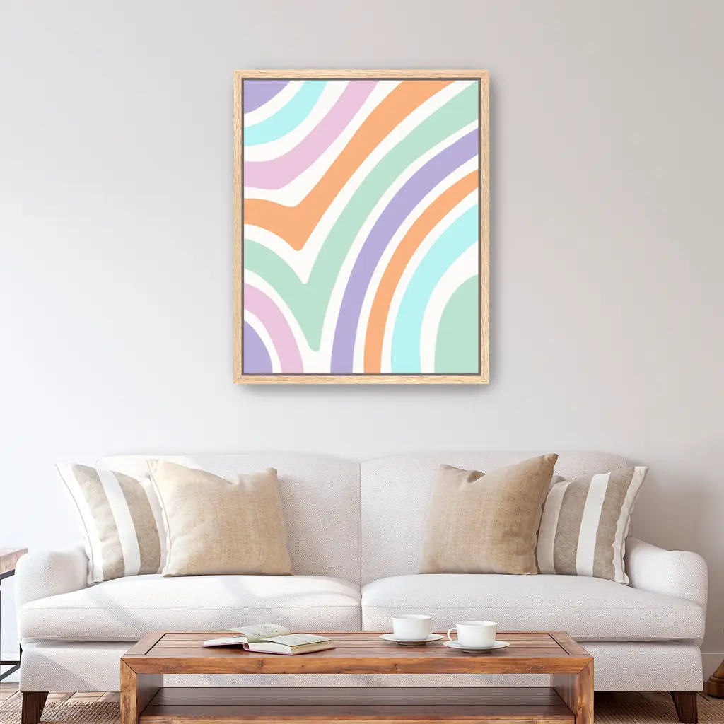 Immerse your space in tranquility with this abstract canvas art, featuring soft, undulating waves in mint green, peach, lilac, and sky blue. The harmonious palette and fluid design evoke a sense of calm and modern elegance Our Gallery Wrap Canvas Prints are proudly assembled with high quality materials in California, USA. Each piece is printed on a thick, archival grade canvas using Giclee technology. It is then hand-stretched by our experienced artisans over solid wood bars, which will not warp over time. The final product is a piece personally crafted for you to confidently display on your wall. Care and Assembly: Ensure that the location of your piece has little to no exposure to heat, sunlight, and moisture. Wipe clean, only if needed. Each piece includes hanging hardware to hang on your wall vertically.
