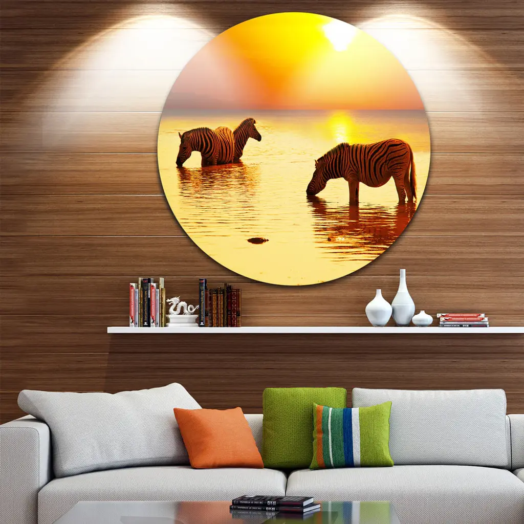 Bring Contemporary Abstraction to your home with this large Circle Metal wall art. This Zebras Drinking in Lake at Sunset Metal Artwork makes it the focal point of any room or office. - White Gloss Coating ensures colors are extra vibrant with light reflection.- Aluminum grade Sheet Metal with 1 inch mounting frame on the back giving the illusion that the artwork is floating on the wall..- Mounting Brackets are included along with instructions.- High Quality Digital images are created directly into a glossy aluminum panel producing a stunning and captivating print into the glossy finish of the metal.- Water, Fire and Scratch resistant HD Aluminum panels.- Looks better than any photo paper and guaranteed to last at least 20 years- Easy to clean with a microfiber cloth. Colors are far superior to regular Canvas Art. - Easy to Hang