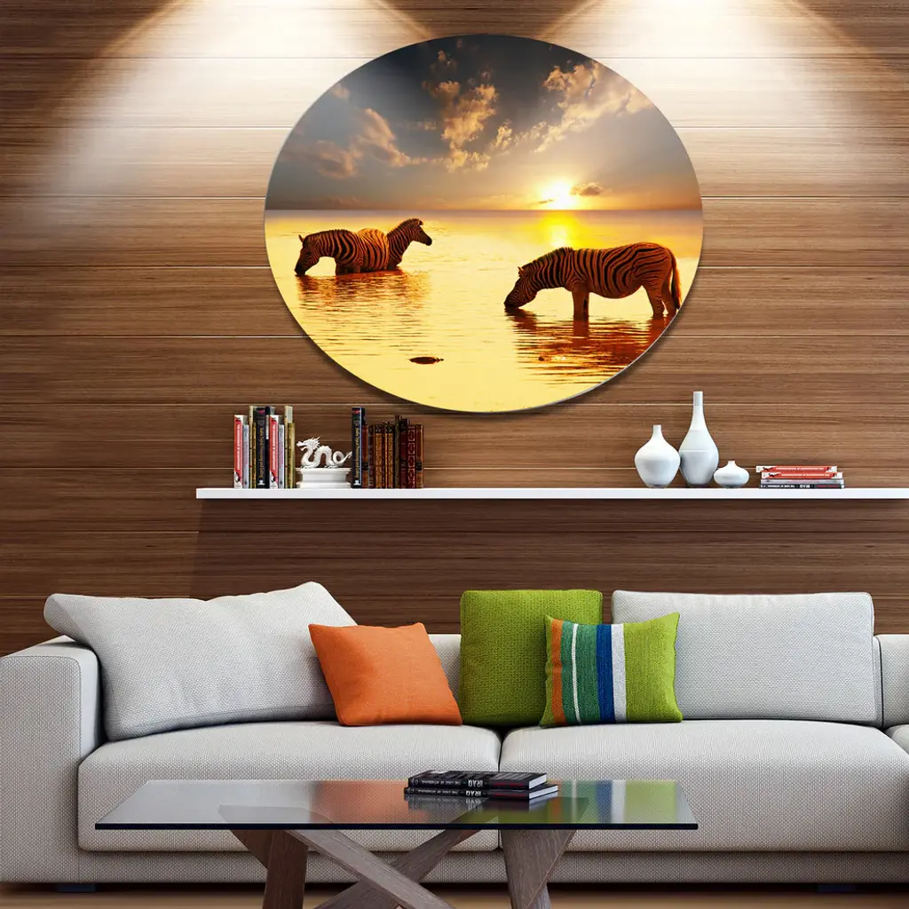 Bring Contemporary Abstraction to your home with this large Circle Metal wall art. This Zebras in Water At Sunset Metal Artwork makes it the focal point of any room or office. - White Gloss Coating ensures colors are extra vibrant with light reflection.- Aluminum grade Sheet Metal with 1 inch mounting frame on the back giving the illusion that the artwork is floating on the wall..- Mounting Brackets are included along with instructions.- High Quality Digital images are created directly into a glossy aluminum panel producing a stunning and captivating print into the glossy finish of the metal.- Water, Fire and Scratch resistant HD Aluminum panels.- Looks better than any photo paper and guaranteed to last at least 20 years- Easy to clean with a microfiber cloth. Colors are far superior to regular Canvas Art. - Easy to Hang