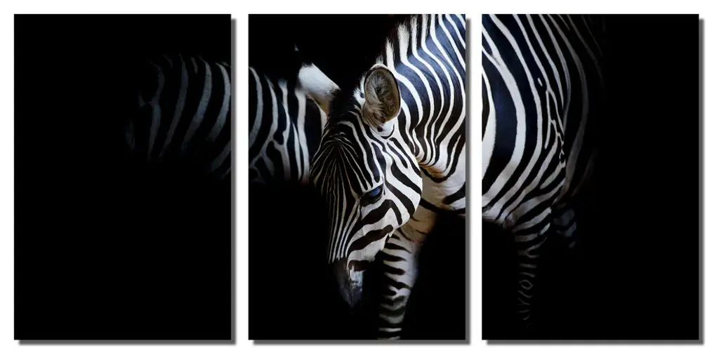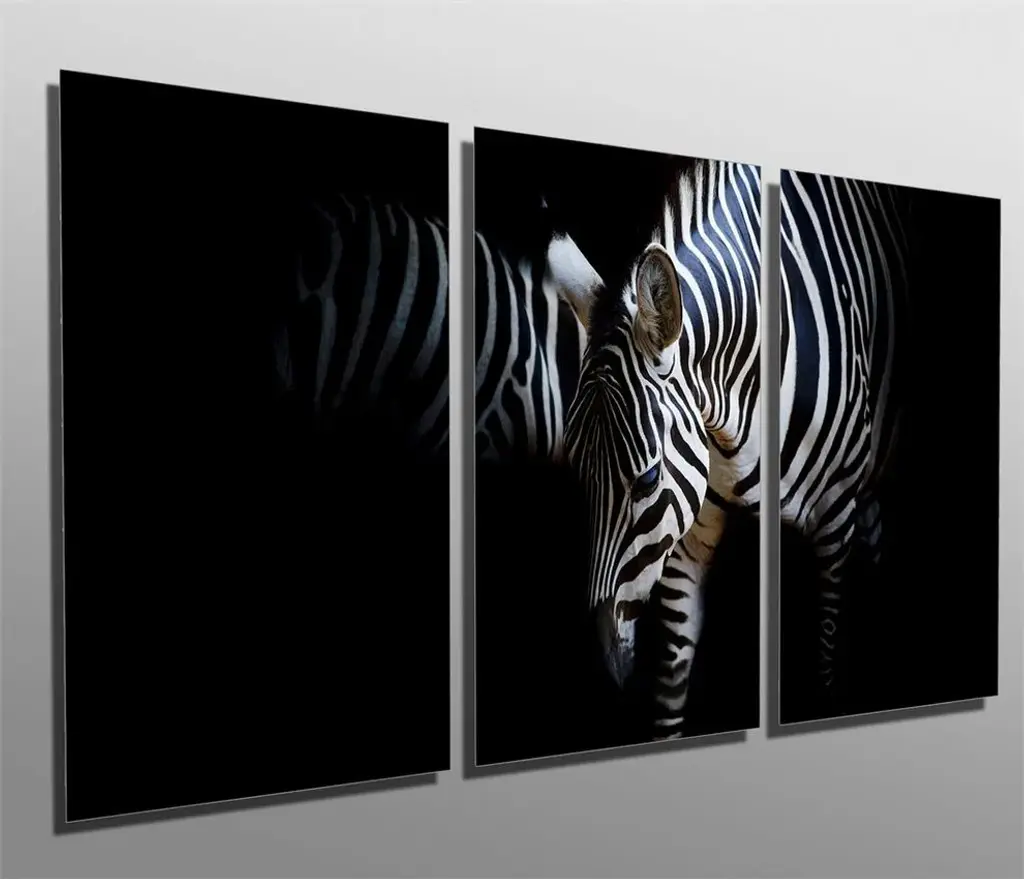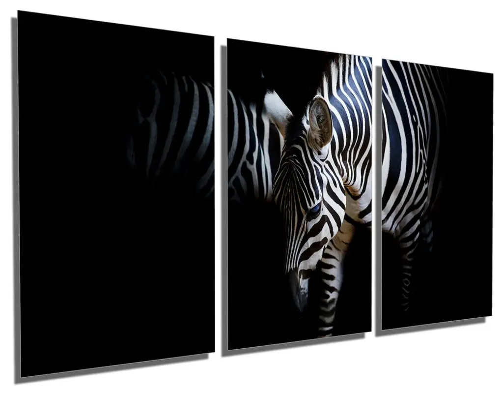 48"œ x 24"œ total size. Ready To Hang! (3 pieces - 16"œ x 24"œ each). 3 Panel Split (Triptych) Metal Print of two zebras, neck to neck with black background. Modern metal wall art for home or office wall decor & interior design. Printed on Luxurious, HD aluminum glossy metal panels. Multi panel art.. HD aluminum panels. Metal print wall art. Includes Shadow Wall Mount on the back.• Aluminum Metal Wall Art• Made in USA• Ready to hang - No assembly required• Shadow mount hardware on the back• 0.045"œ thick HD Aluminum Panels• Scratch resistant, glossy finish• Superb color clarity, luxurious prints• Epson printing process• For indoor or moisture rich environment use• Easy to clean. Gently wipe with microfiber cloth.