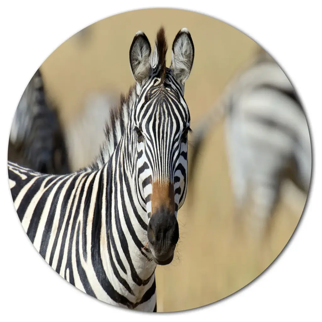 Bring Contemporary Abstraction to your home with this large Circle Metal wall art. This Zebras Socializing and Kissing Metal Artwork makes it the focal point of any room or office. - White Gloss Coating ensures colors are extra vibrant with light reflection.- Aluminum grade Sheet Metal with 1 inch mounting frame on the back giving the illusion that the artwork is floating on the wall..- Mounting Brackets are included along with instructions.- High Quality Digital images are created directly into a glossy aluminum panel producing a stunning and captivating print into the glossy finish of the metal.- Water, Fire and Scratch resistant HD Aluminum panels.- Looks better than any photo paper and guaranteed to last at least 20 years- Easy to clean with a microfiber cloth. Colors are far superior to regular Canvas Art. - Easy to Hang