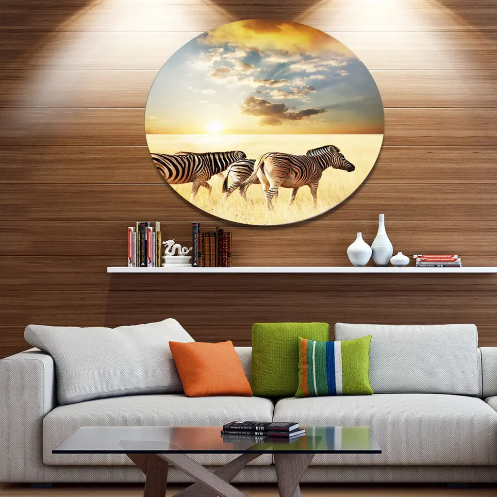 Bring Contemporary Abstraction to your home with this large Circle Metal wall art. This Zebras Walking in African Grassland Metal Artwork makes it the focal point of any room or office. - White Gloss Coating ensures colors are extra vibrant with light reflection.- Aluminum grade Sheet Metal with 1 inch mounting frame on the back giving the illusion that the artwork is floating on the wall..- Mounting Brackets are included along with instructions.- High Quality Digital images are created directly into a glossy aluminum panel producing a stunning and captivating print into the glossy finish of the metal.- Water, Fire and Scratch resistant HD Aluminum panels.- Looks better than any photo paper and guaranteed to last at least 20 years- Easy to clean with a microfiber cloth. Colors are far superior to regular Canvas Art. - Easy to Hang