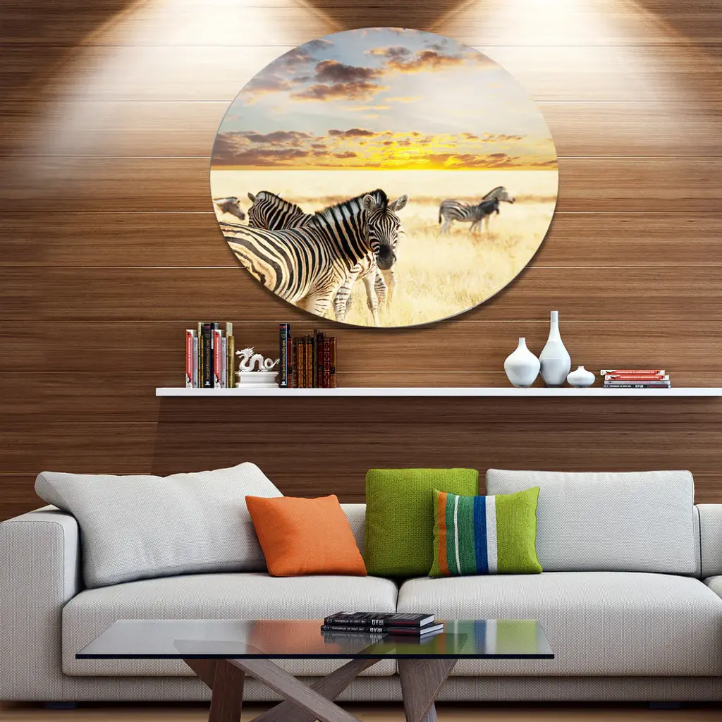 Bring Contemporary Abstraction to your home with this large Circle Metal wall art. This Zebras Walking in Bush under Clouds Metal Artwork makes it the focal point of any room or office. - White Gloss Coating ensures colors are extra vibrant with light reflection.- Aluminum grade Sheet Metal with 1 inch mounting frame on the back giving the illusion that the artwork is floating on the wall..- Mounting Brackets are included along with instructions.- High Quality Digital images are created directly into a glossy aluminum panel producing a stunning and captivating print into the glossy finish of the metal.- Water, Fire and Scratch resistant HD Aluminum panels.- Looks better than any photo paper and guaranteed to last at least 20 years- Easy to clean with a microfiber cloth. Colors are far superior to regular Canvas Art. - Easy to Hang