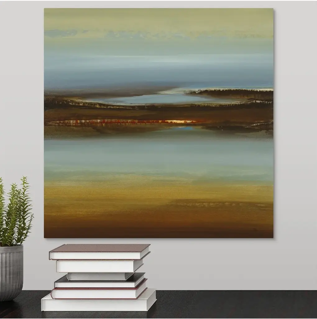 Gallery-Wrapped Canvas entitled 'Zen Land'. This soothing wall art for the home or office is an abstract painting of streaks and swaths of color that look like a sunrise reflecting in water. Multiple sizes available. Primary colors within this image include: Brown, Black, Light Gray. Made in the USA. All products come with a 365 day workmanship guarantee. Inks used are latex-based and designed to last. Canvases have a UVB protection built in to protect against fading and moisture and are designed to last for over 100 years. Museum-quality, artist-grade canvas mounted on sturdy wooden stretcher bars 1.5" thick. Comes ready to hang.