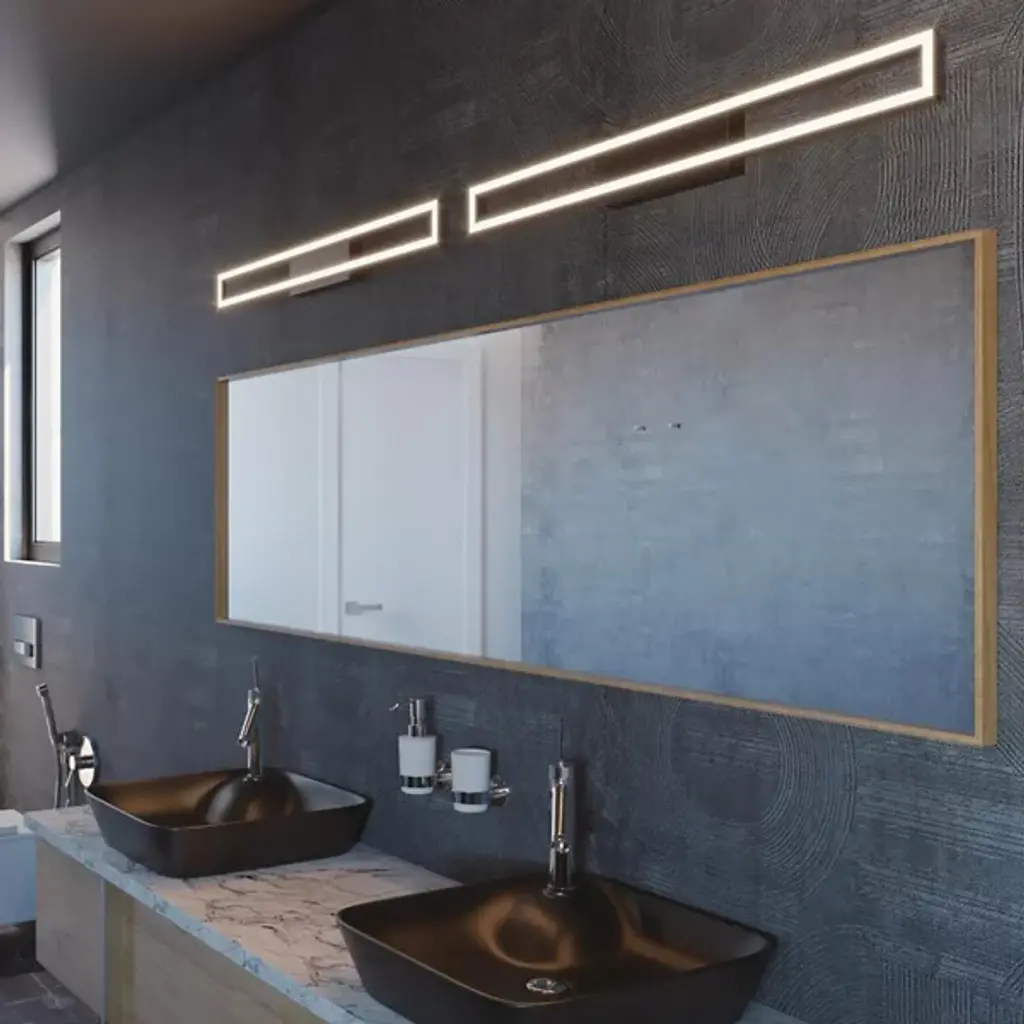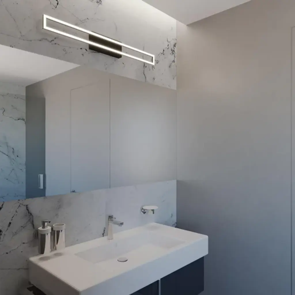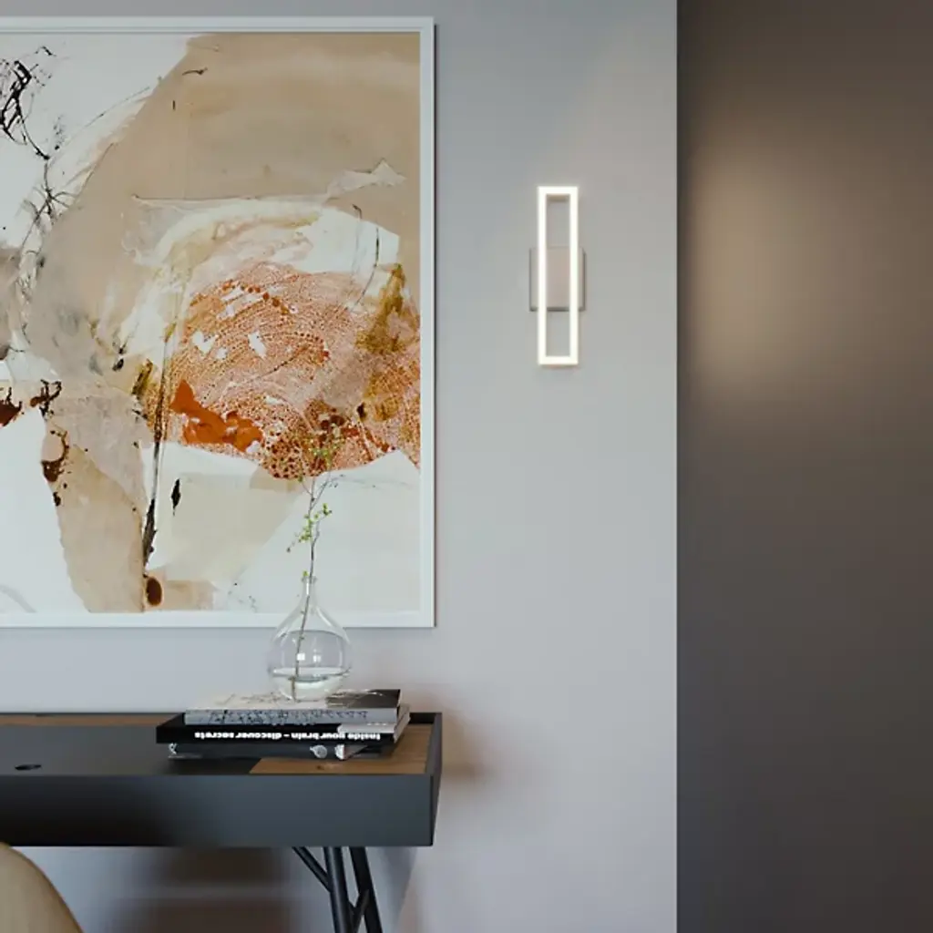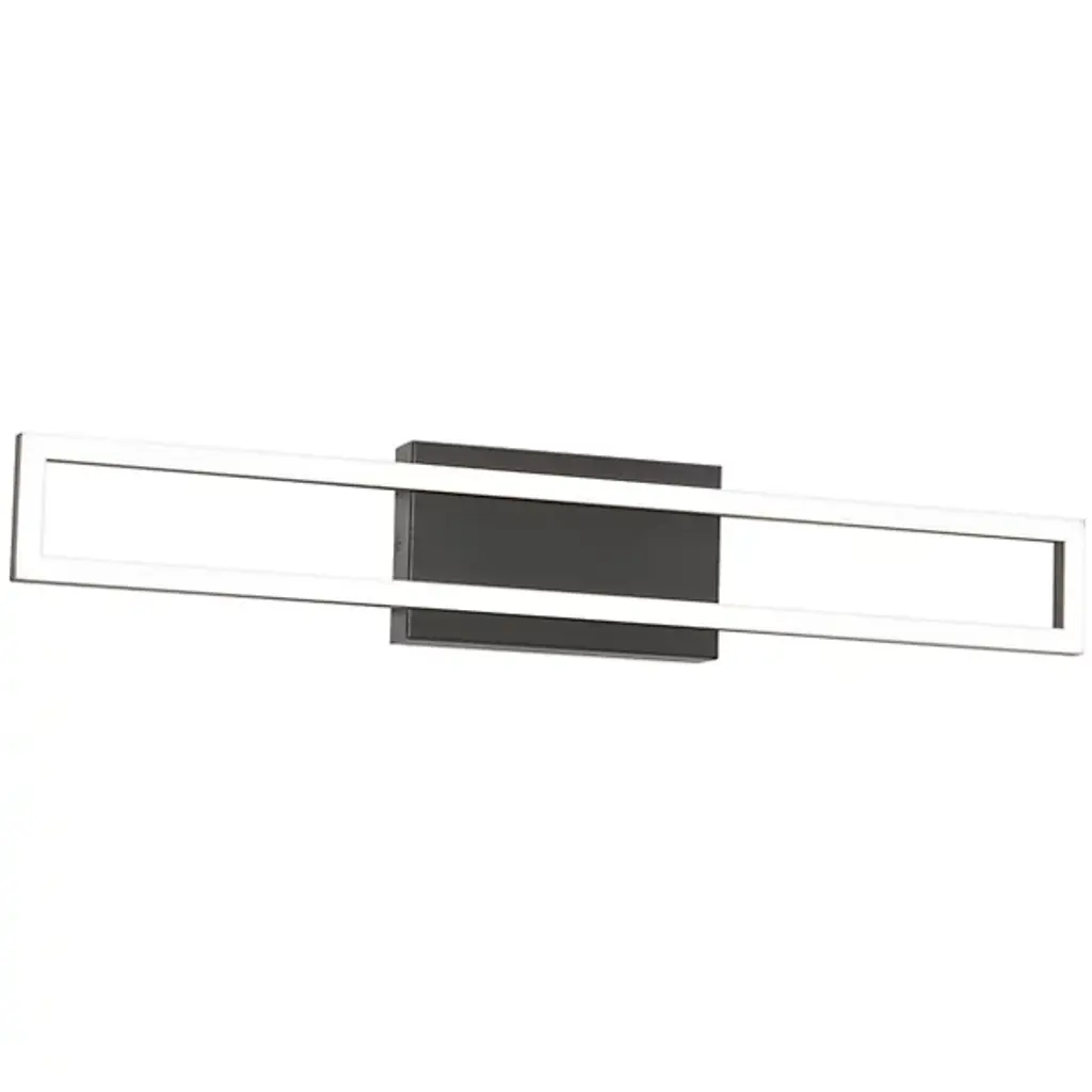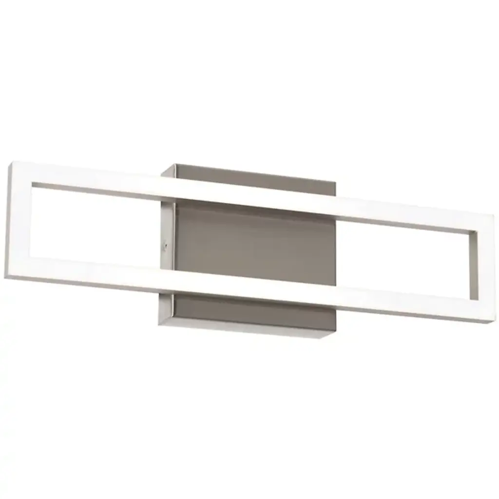 A gorgeously graphic way to illuminate a contemporary bathroom. With its frame-like design, the Zola LED Vanity Light by AFX gives the impression of being a glowing work of art, as well as a functional vanity light. Mounted on a strong Steel wall plate, this fixture features a sharp rectangular frame with a channel that houses a continuous ring of bright and energy efficient LEDs. Over these LEDs, a slender panel of White Acrylic ensures a seamless look, not to mention bright and evenly diffused light. Use this bath bar to create a bright impression above or on either side of a vanity mirror.