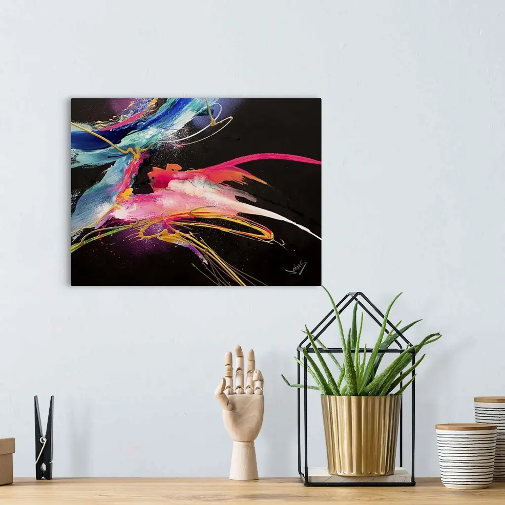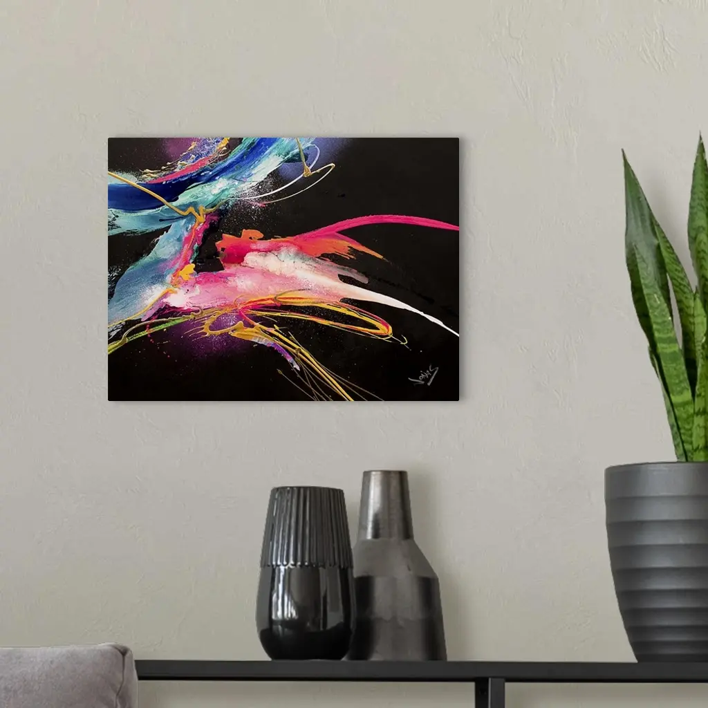 A contemporary abstract painting of wild neon colors moving fast and aggressive motions against a black background.