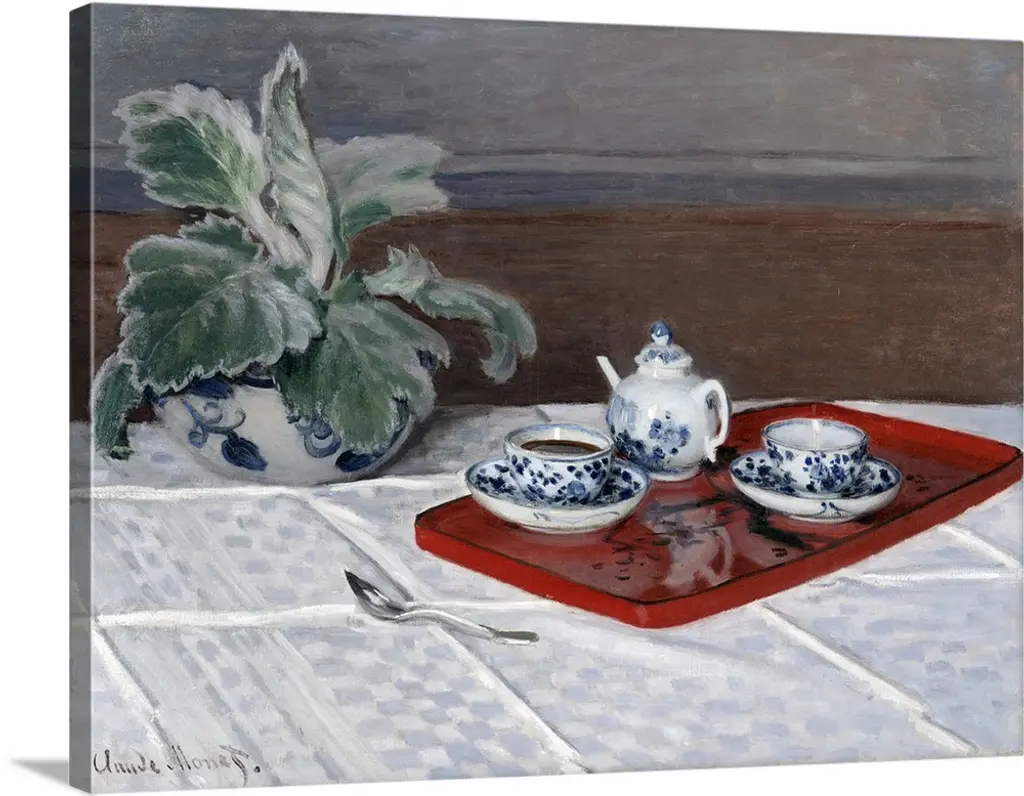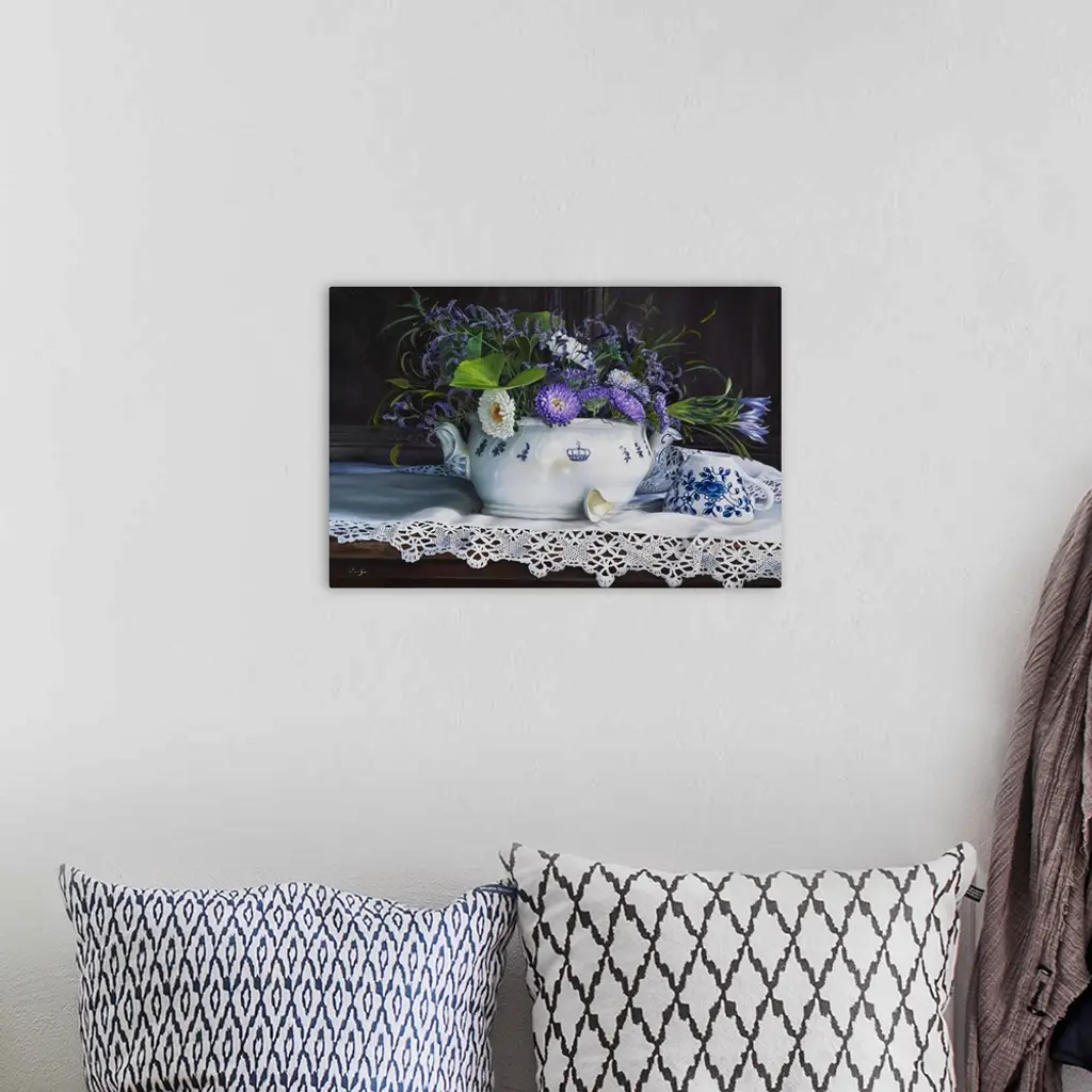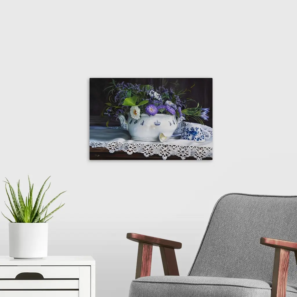 Contemporary still life painting of a short white vase holding purple flowers on a lace cloth.