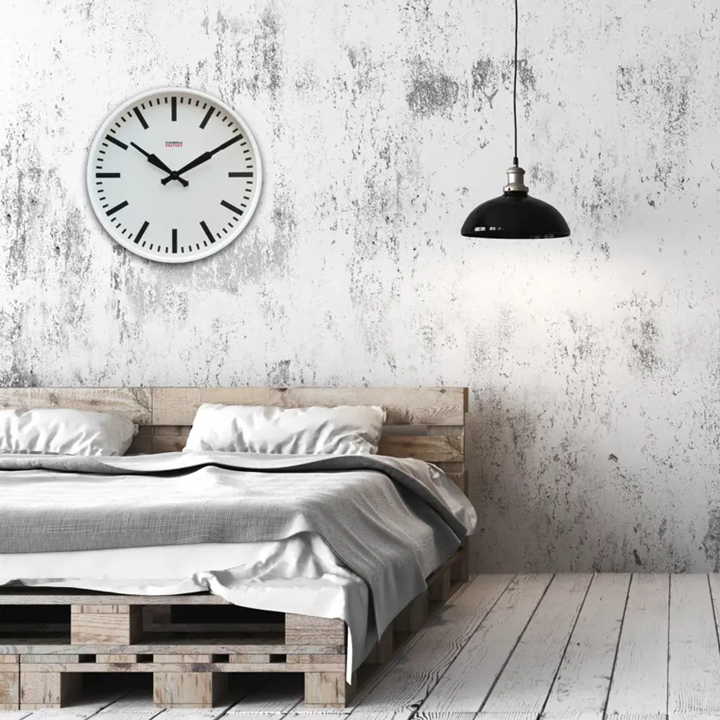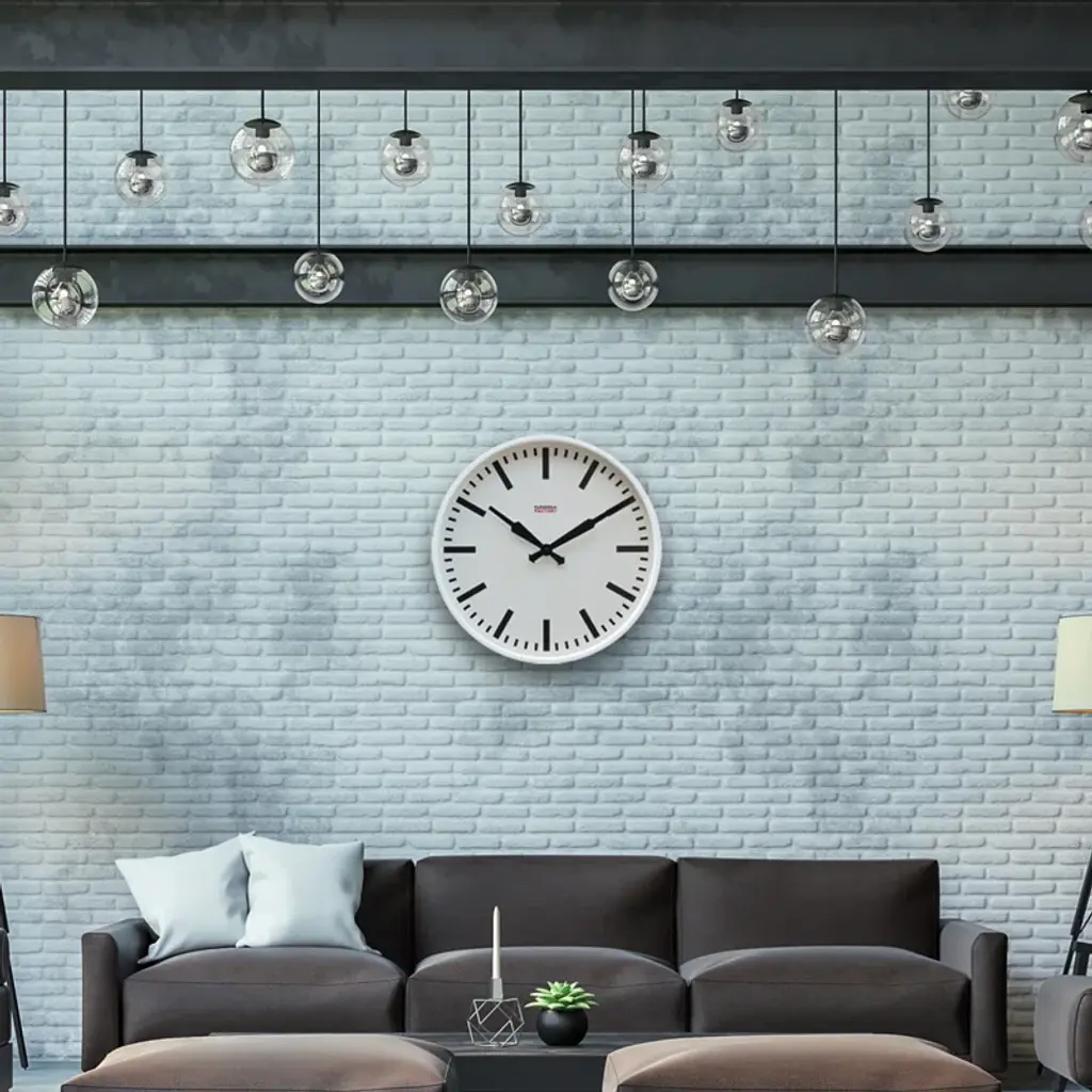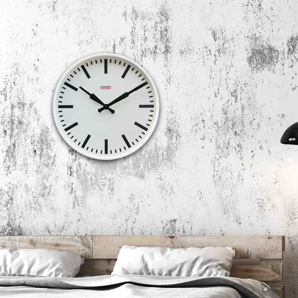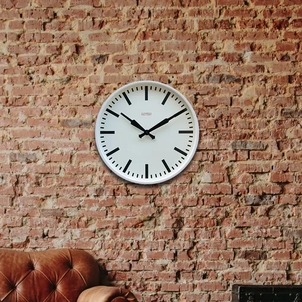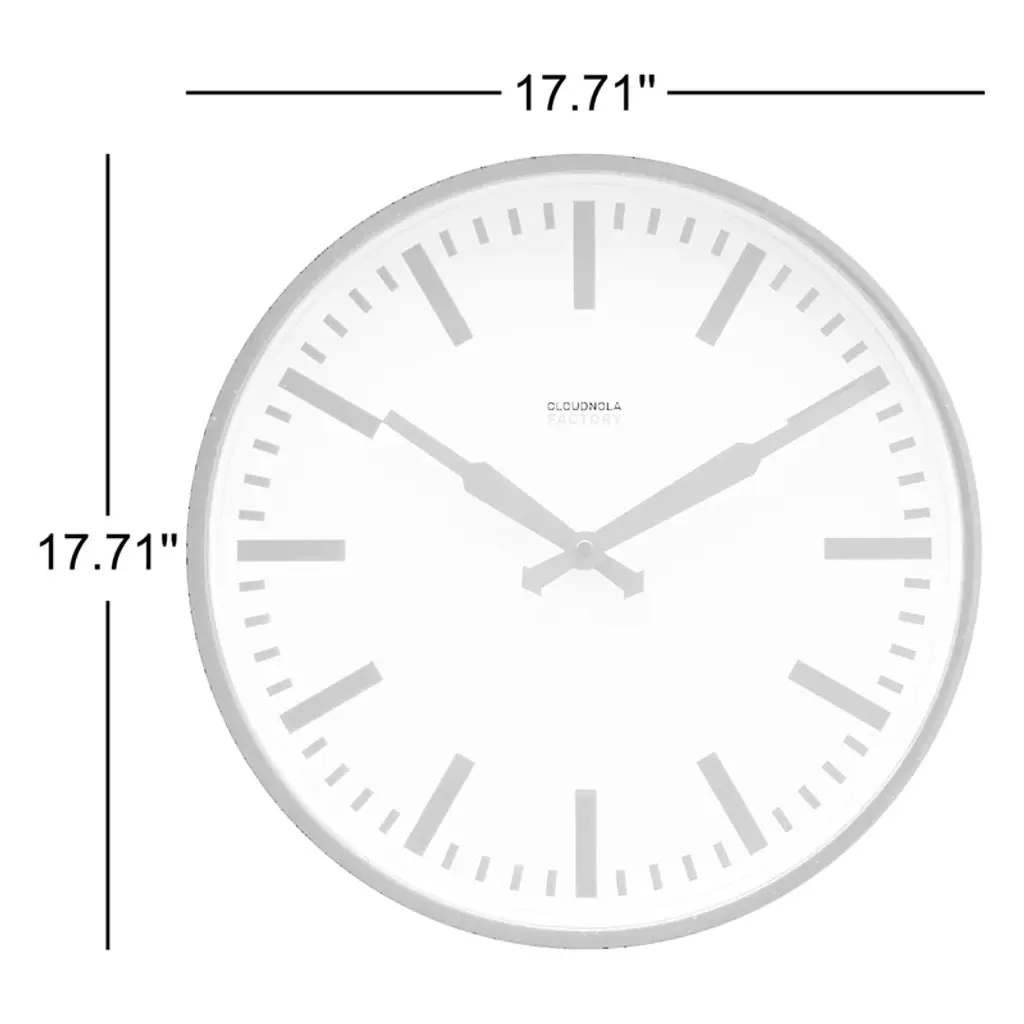 Inspired by the scale and durability of wall clocks, the wall clock is constructed with a bold steel case, a minimalistic dial, and a glass lens. Our clock is an ode to eras past. White is 18" diameter, Yellow is 18" diameter, and black is 12" diameter.