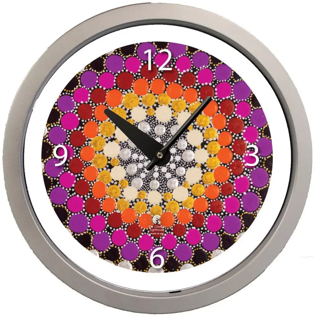 Made in the USA by people who are blind. Artist Series Amy Diener - Warm 14.5" Silver Contemporary Body Quartz Movement Decorative Wall Clock Beautiful and colorful clock face provided by renowned artist Amy Diener. Amy Diener is a lover of art, color, and travel! Creating art is her way of expressing her life journey. Painting is a positive outlet that reflects her life and the world around her. She creates detailed dot paintings that take on various subjects such as mandalas, animals, trees, flowers, and portraits.