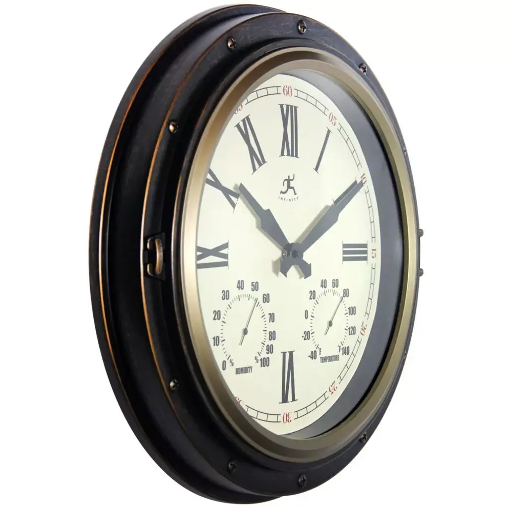 The Forecaster has been one of Infinity Instruments's most popular indoor/outdoor wall clocks. With its distressed black case, rivets, latch accents and slightly weathered bronze finish, the Forecaster cuts a striking profile. This rugged indoor/outdoor clock features an off-white clock face with easy-to-read black hands. The Forecaster is water resistant, and features a built-in thermometer and hygrometer that accurately measures ambient temperature and humidity. Add bold style to anywhere inside or outside of your home with the Forecaster.