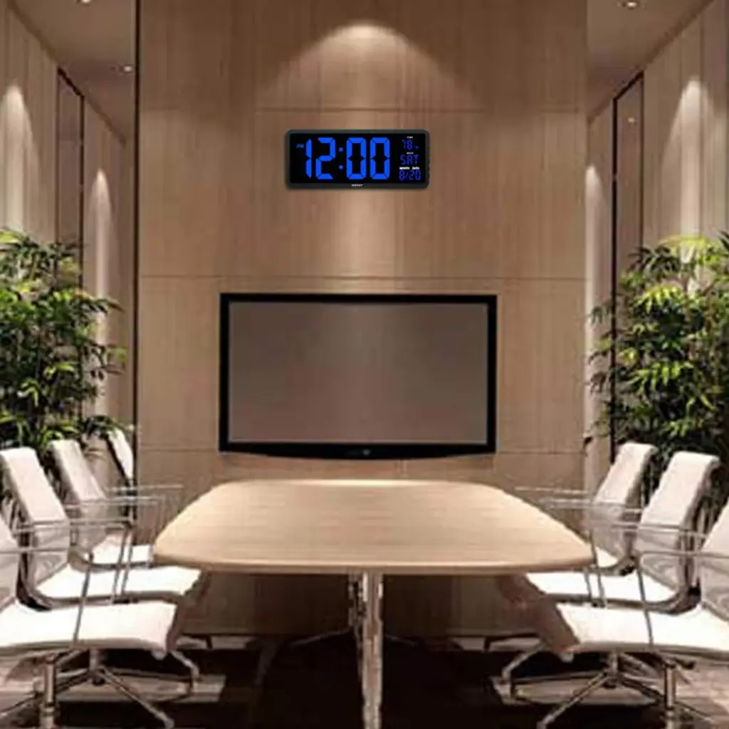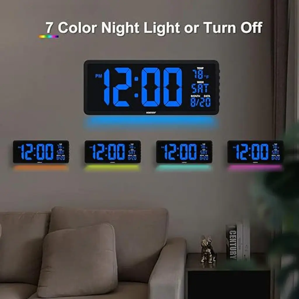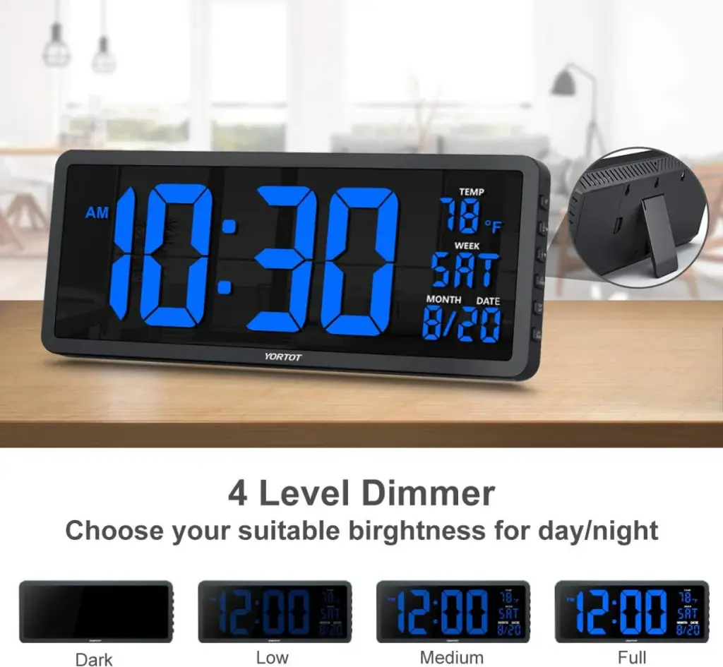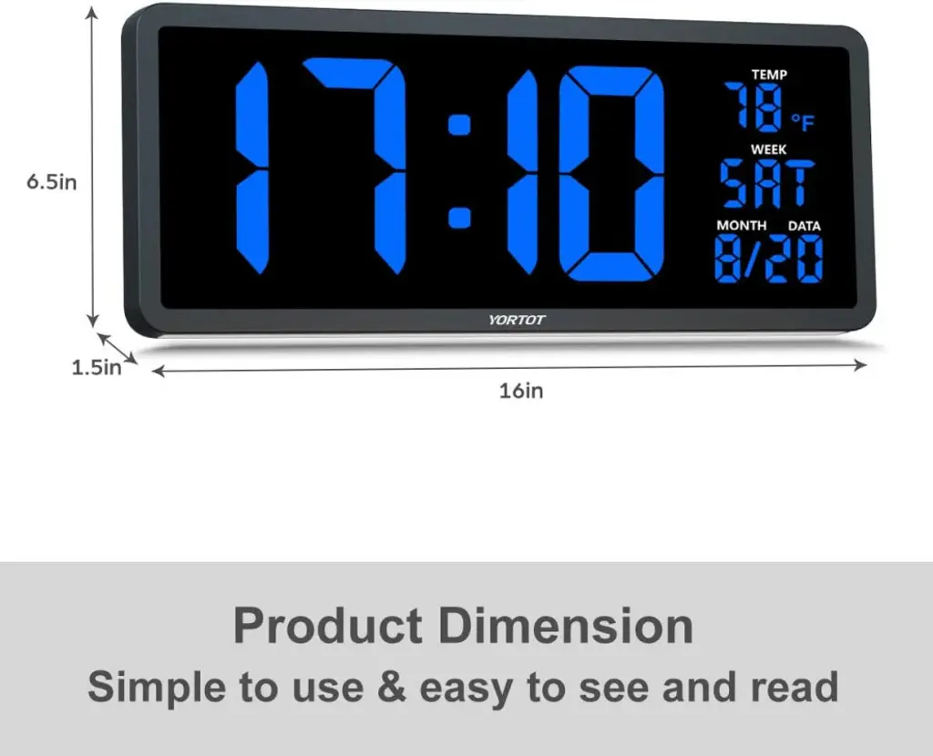 Color:: Blue + RemoteDisplay Type: DigitalStyle: ModernSpecial Feature: Remote Control / 7 Color: s Light / Larger Display / Adjustable BrightnessProduct Dimensions:: 16"W x 6.5"HPower Source:: Corded Electric, Battery PoweredAge Range (Description): KidRoom Type: KitchenShape: RectangularREMOTE CONTROLLED 16-INCH DIGITAL WALL CLOCK: The YORTOT digital wall clock measures a massive 16 inches in length, making it easy to see and read even from a distance. In addition to the time. The date, day of week, and temperature is also clearly displayed. It is perfect for large spaces. such as gyms, shops, warehouses, garages, or classrooms, offices, as well as your living room, kitchen, and even the bedroom!4 LEVEL ADJUSTABLE BRIGHTNESS DISPLAY: Featuring a 4-level adjustable brightness display( included full dark), you can easily set the screen to your favorite brightness by using the remote control. The lower brightness levels make it the perfect clock for your bedroom without bothering your sleep.7 COLOR NIGHTLIGHT WITH 4 LEVEL DIMMER: The 7 color night-light makes the clock versatile for numerous environments. Choose the nightlight color that best suits your decor or preference to create a great atmosphere. Along with the 4-level brightness control. You can adjust brightness as you desire or turn it off.CONVENIENT WALL MOUNT AND FOLD-OUT STAND: The clock features 3 equally spaced keyholes for easy mounting on a wall. A foldable stand is also present at the back, to easily prop it on top of a table.OUTLET POWERED ONLY & MEMORY FUNCTION : While it is a plug-in clock, the 2• AAA battery backup (not included) help you save time and settings. You do not have to reset the settings when reconnecting after a power outage. The screen goes blank during battery backup. YORTOT also gives you a 18-month warranty along with a 45-day return policy.Please feel free to purchase!Product SpecificationsTime Format: 12/24 HourDisplay: Time/Date/Day of Week/Indoor TempAuto DST: Turn On/OffDisplay Dimmer: 5-Level AdjustableNightlight Brightness: 4-Level AdjustableNightlight Color:: Red/Orange/Yellow/Green/Cyan/Blue/PurplePower Input: AC 100-240V, 50/60HzPower Source:: Corded ElectricProduct Dimension: 16 x 6.5 x 1.5 InchesDigit Size: 4.5 InchMounting Type: Wall-mounted/Foldable Stand