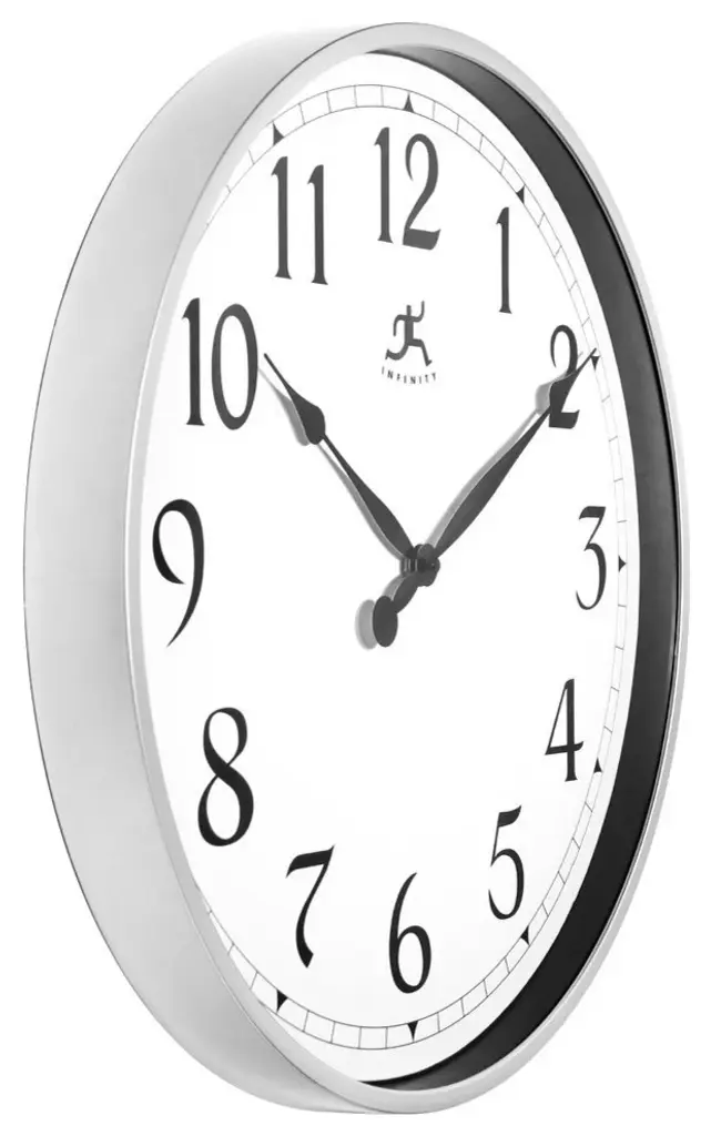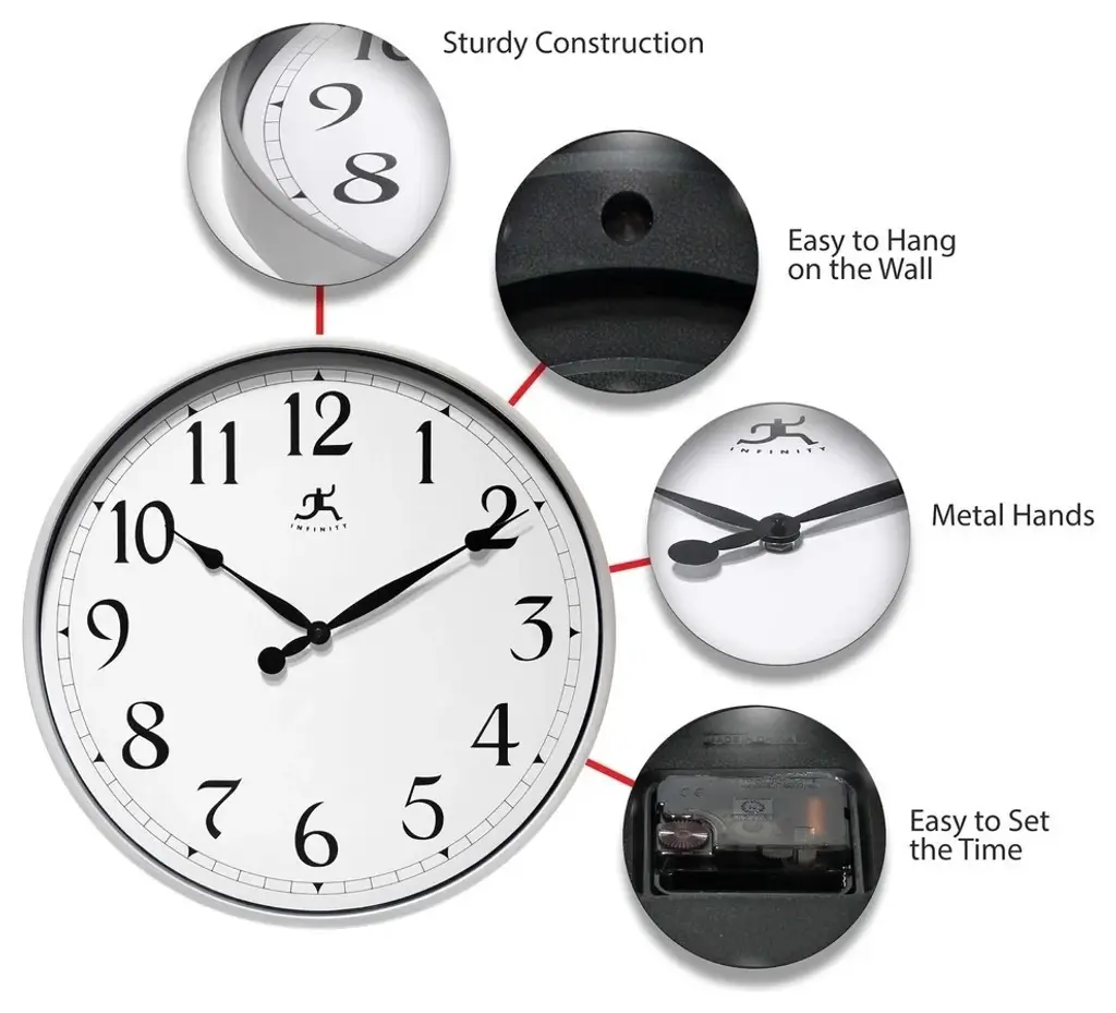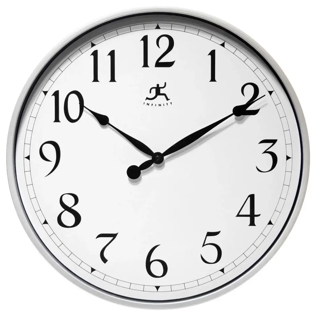 Give your home a classic touch with this 18" Silver Decorative Wall Clock! This office clock/business clock has a large open face and is perfect in all rooms in any business setting. People with simple tastes will gravitate toward this clock owing to its minimalistic design principles.With black metal hands and simple but modern black numbering against a clean white clock face, it is the perfect way to display time in a modern/contemporary type of decor. Its large size makes it perfect for working on projects or cooking! Place this wall clock in your living room, office or kitchen for a classic look. You will love the minimalistic design with basic black and white coloring. What''s also to love about the clock is that it has shatter resistant lens, a no fuss option for a classic time piece. It has a quartz mechanism for accurate time keeping and uses a single AA battery.