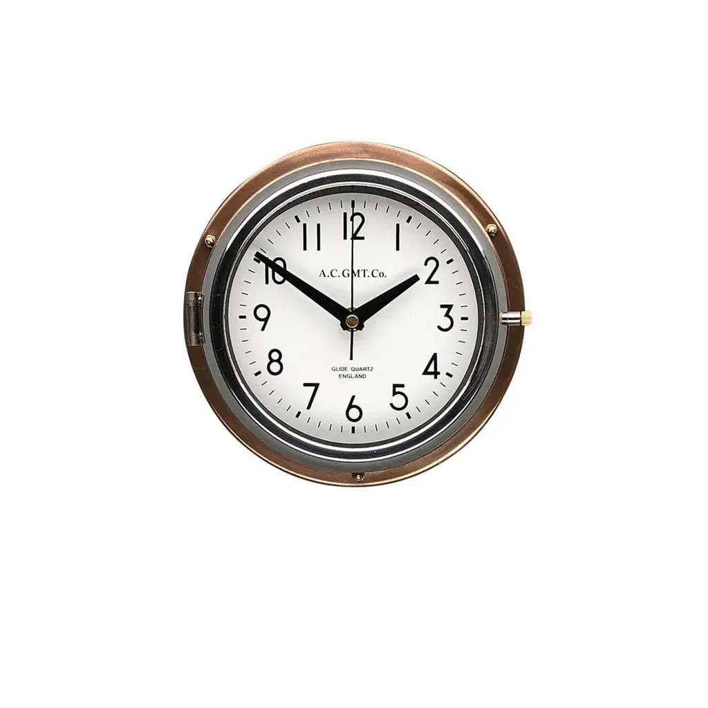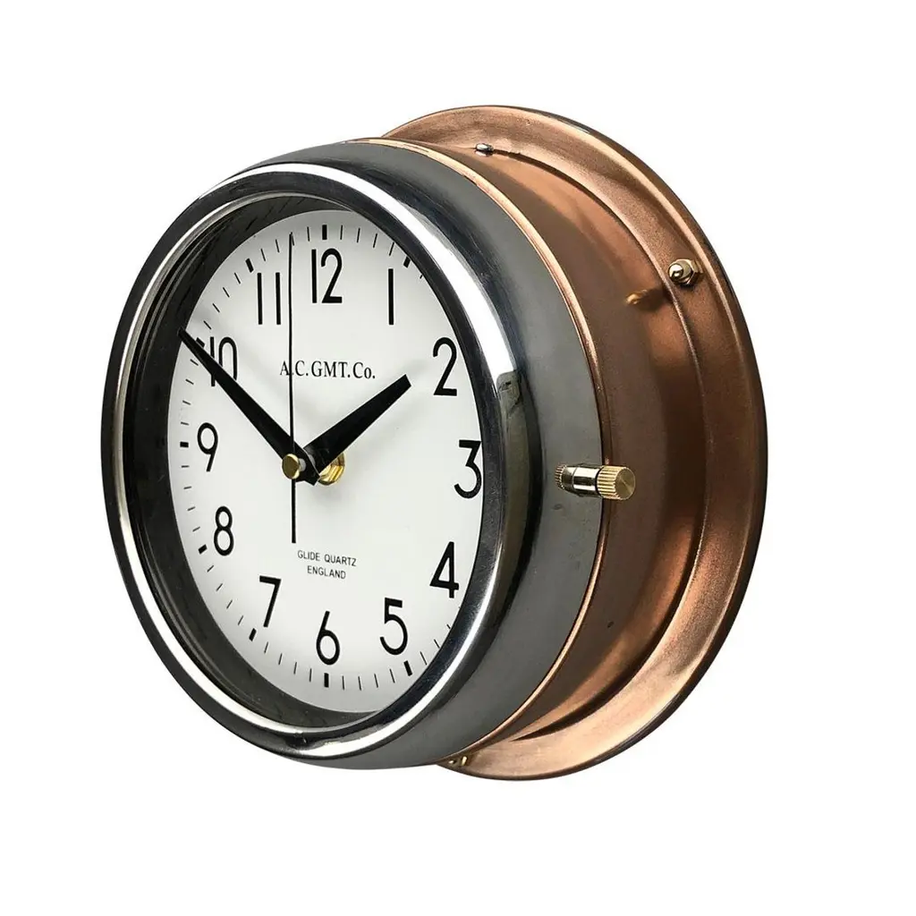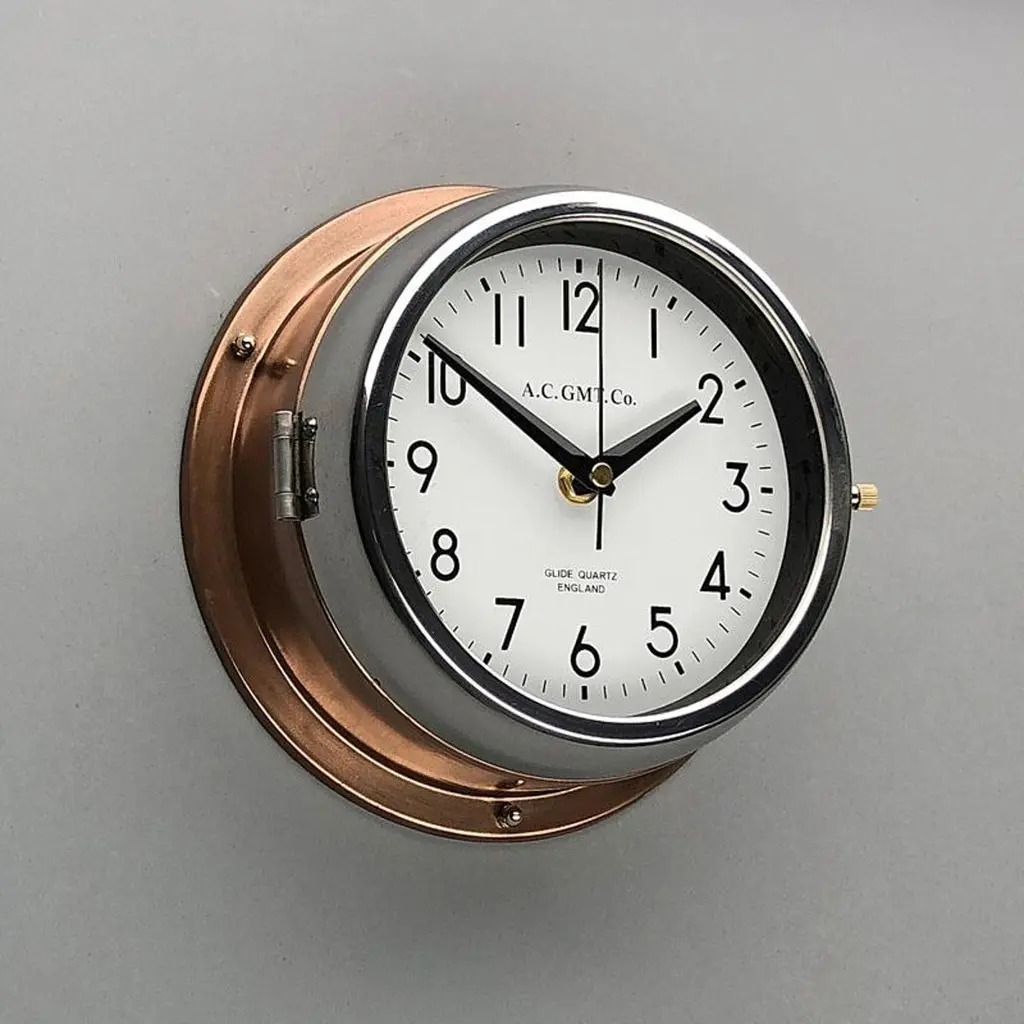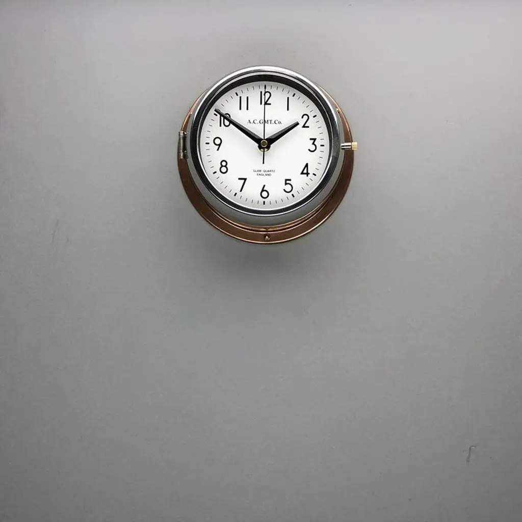 Rescued from Industrial scrap yards and brought back to life in our UK workshop, our expert process allows us to create a high quality clock of luxury standards. At A.C GMT Co. we apply new paint finishes or lustrous copper and bronze to the clock case. Our high speed polishing machine restores the chrome bezel, which then frames one of our high definition screen printed dials. These clocks were originally slave or secondary clocks used on cargo ships and super tankers, they would have been controlled by a master clock on board. The movement has been replaced with a Seiko silent sweep seconds movement powered by a AA battery to make them suitable for use in all exclusive interiors on dry land. Measures: Diameter 20 cm. Depth 8 cm.