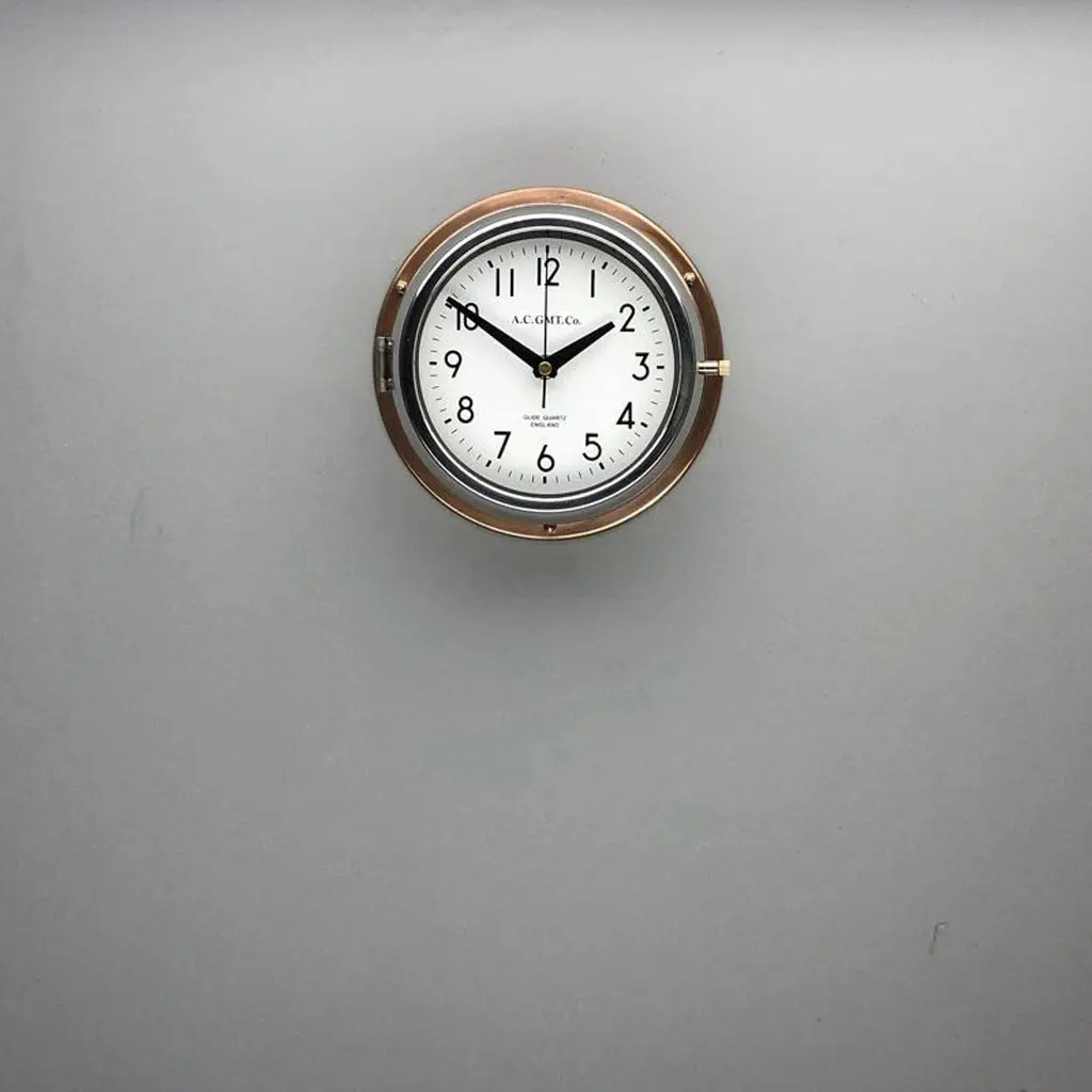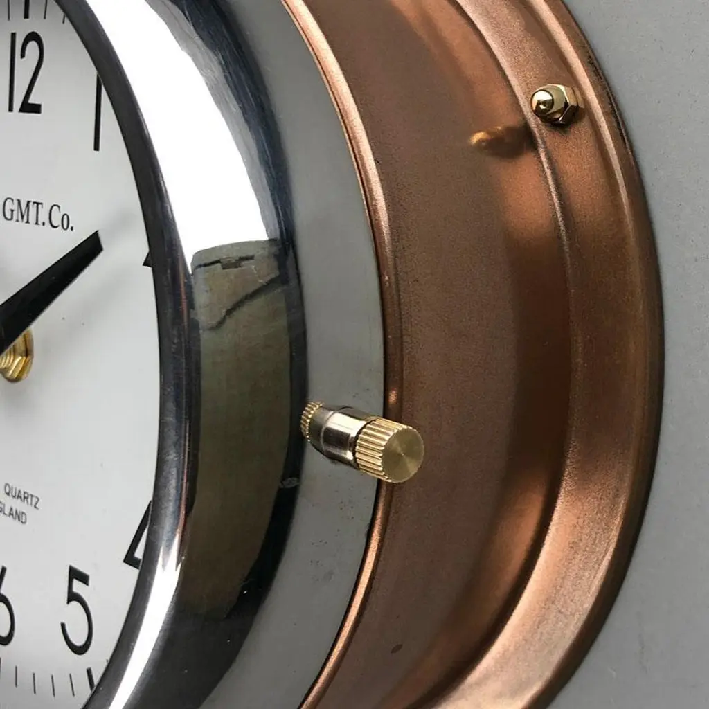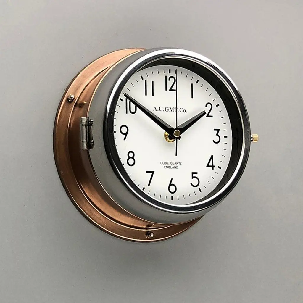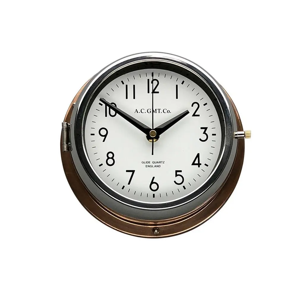 Rescued from Industrial scrap yards and brought back to life in our UK workshop, our expert process allows us to create a high quality clock of luxury standards. At A.C GMT Co. we apply new paint finishes or lustrous copper and bronze to the clock case. Our high speed polishing machine restores the chrome bezel, which then frames one of our high definition screen printed dials. These clocks were originally slave or secondary clocks used on cargo ships and super tankers, they would have been controlled by a master clock on board. The movement has been replaced with a Seiko silent sweep seconds movement powered by a AA battery to make them suitable for use in all exclusive interiors on dry land. Measures: Diameter 20 cm. Depth 8 cm.