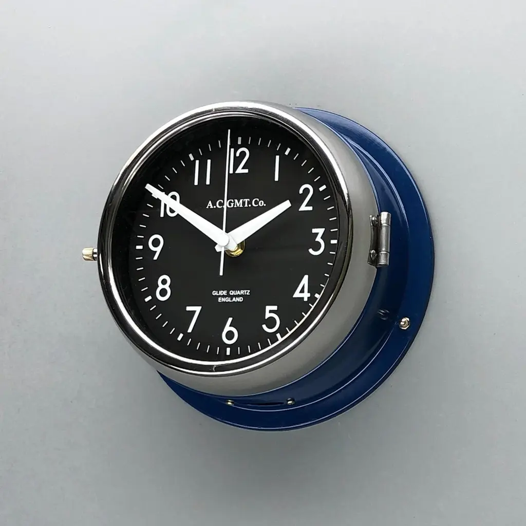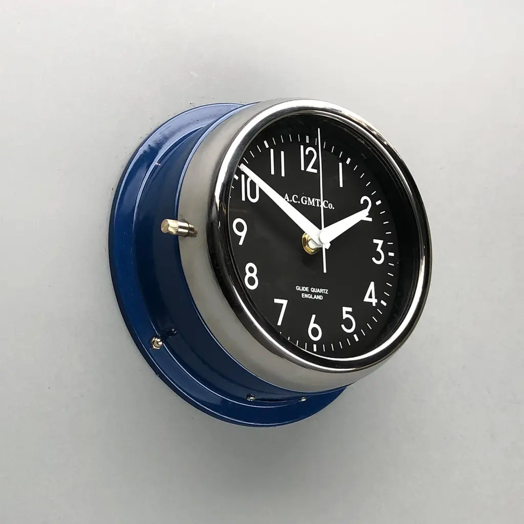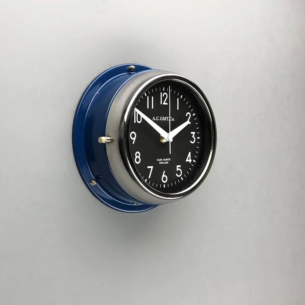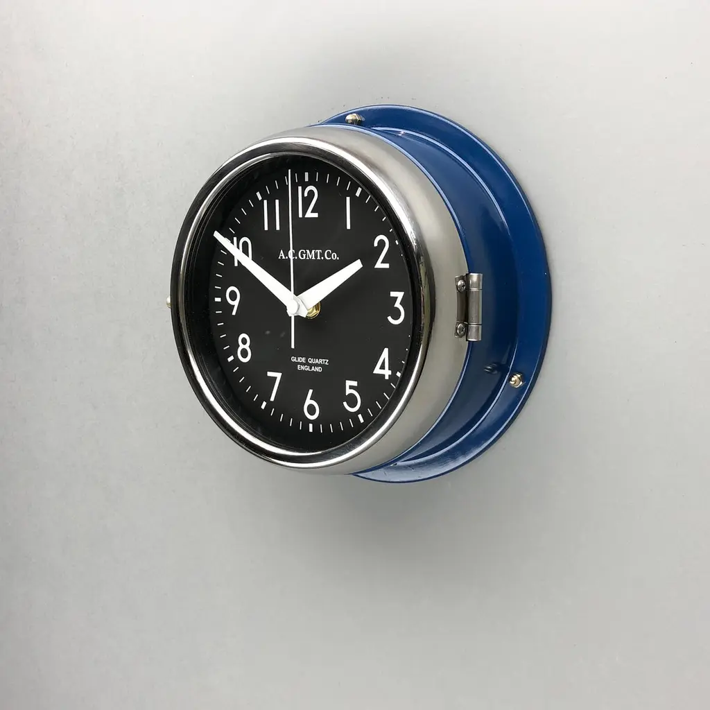 1970s British Classic Blue & Chrome Ac.gmt.co. Industrial Wall Clock Black Dial