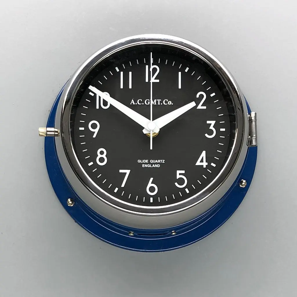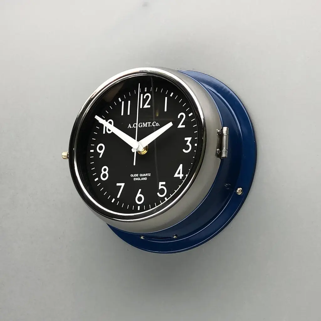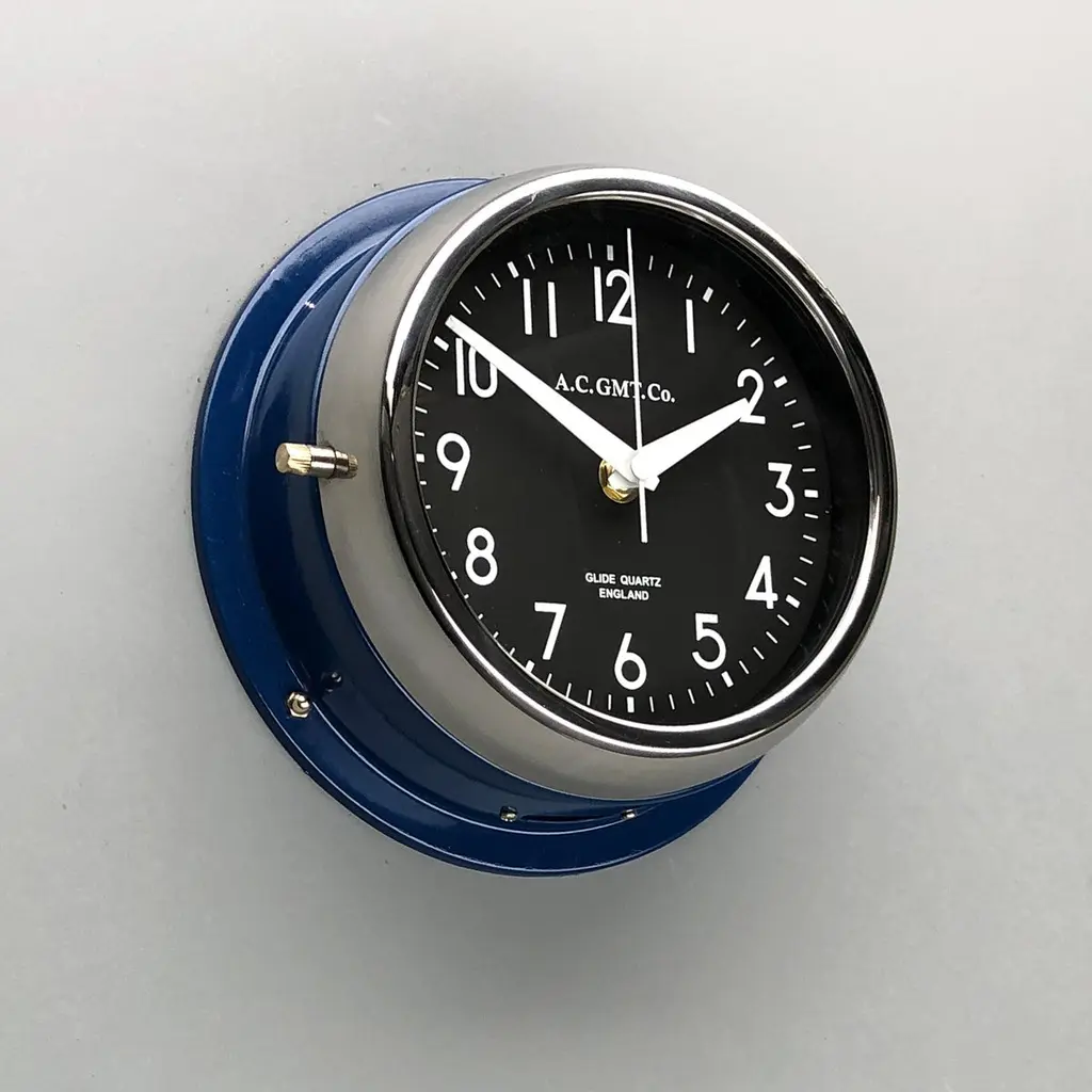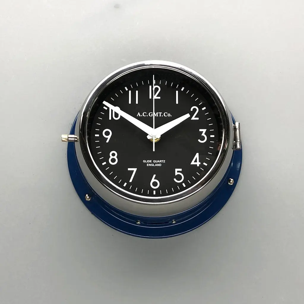 1970s British Classic Blue & Chrome Ac.gmt.co. Industrial Wall Clock Black Dial
