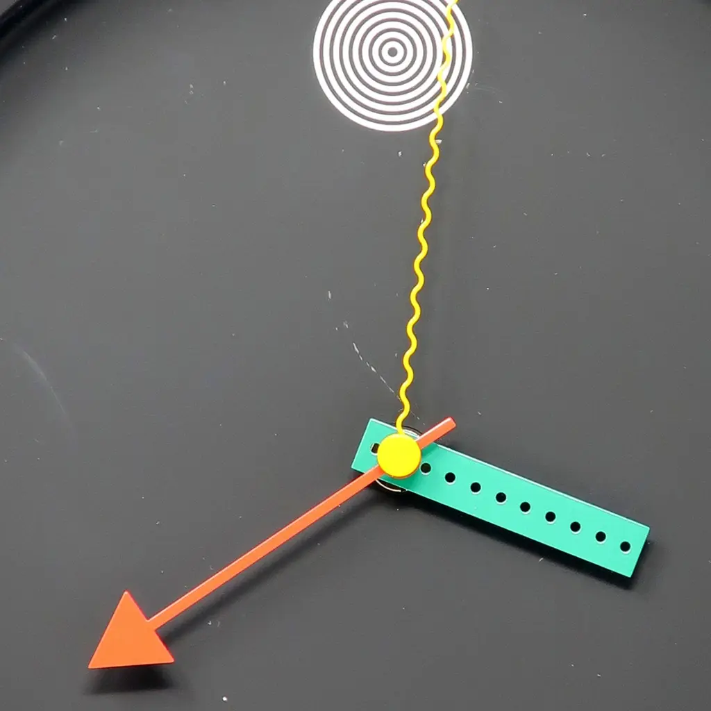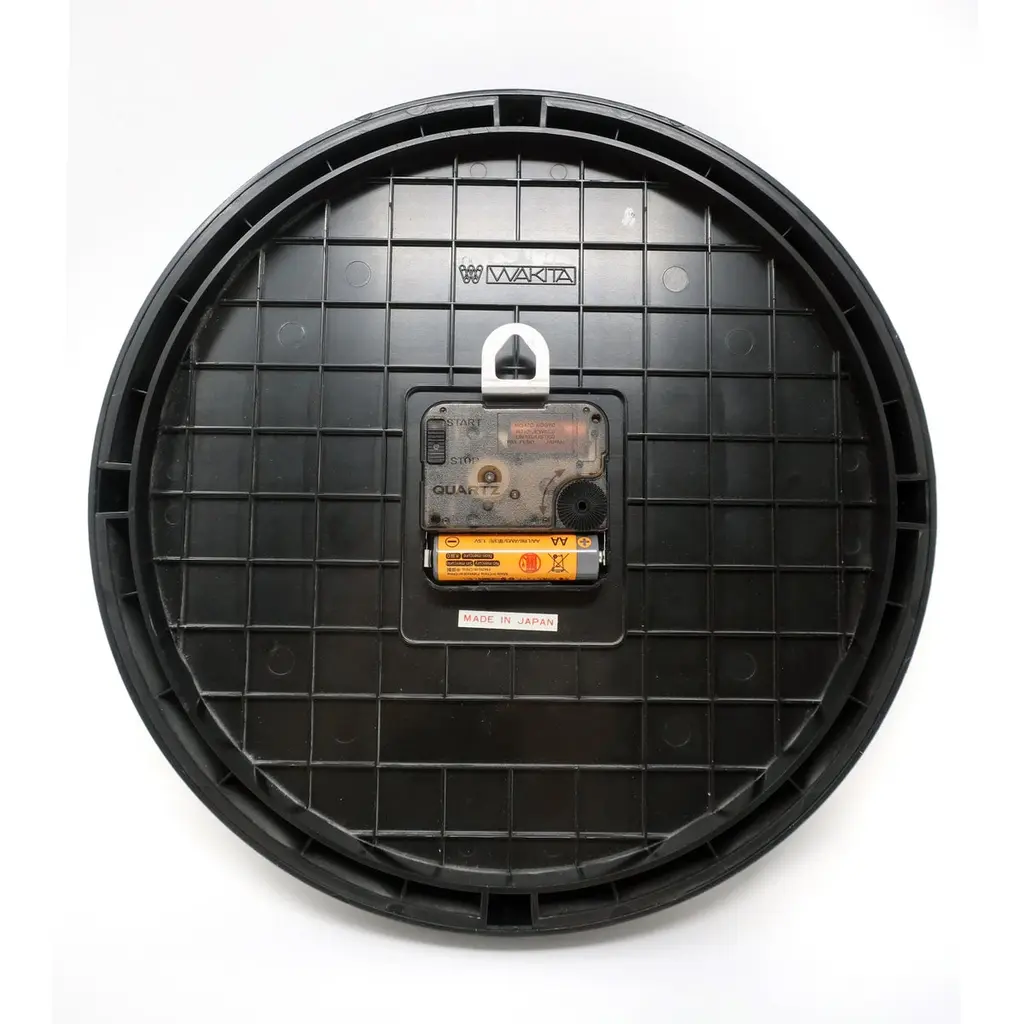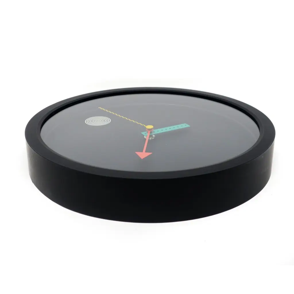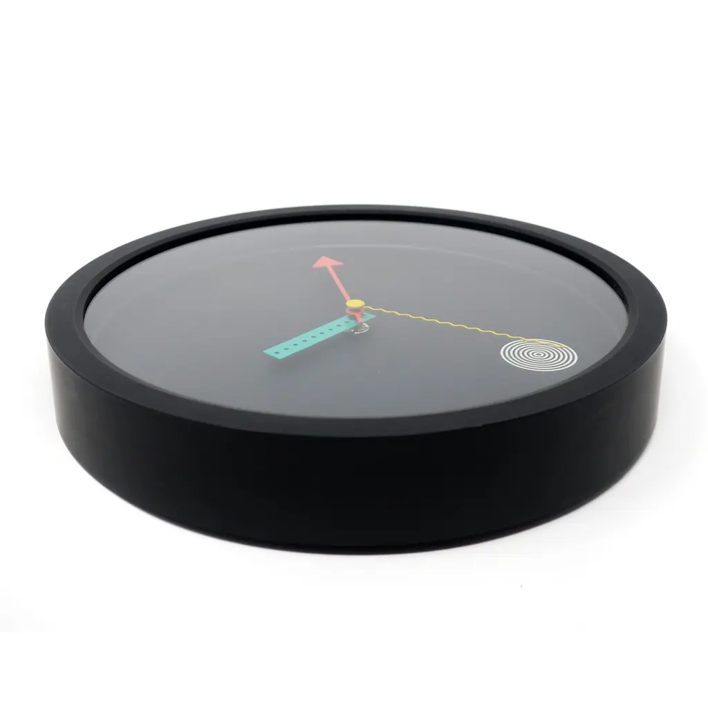 A perfectly elegant and sophisticated 1980s wall clock designed by Shohei Mihara for Wakita. Postmodern, Memphis-influenced design at its finest! Black with white, red, green, and yellow accents. Battery operated and works great.In very good vintage condition with wear consistent with age and use. Very faint surface wear face. Made in Japan.Measures: 10" x 10" x 1.5".
