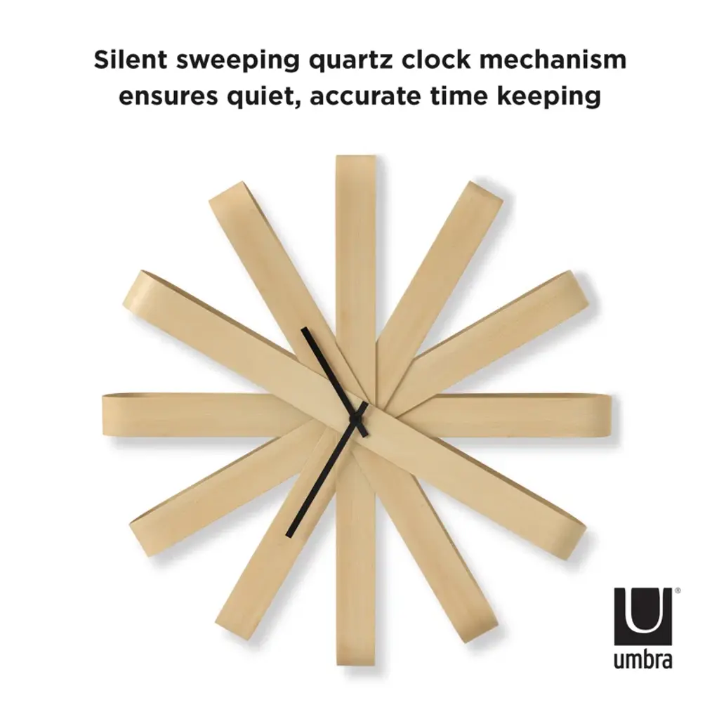 This gorgeous clock is made from bent beech wood that has been shaped into folded ribbon shapes. Its contrasting minute and hour hands make it easy to tell the time. Ribbonwood's bentwood is part of a complex process of molding bent plywood. A quiet, functional clock, this clock operates on a silent sweeping quartz clock mechanism, ensuring precise and maintenance-free performance of the clock. Setting up and mounting Ribbonwood takes only minutes. Only 1 AA battery is required and you are set.