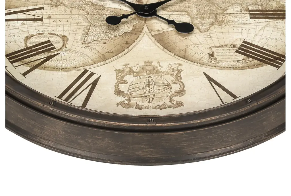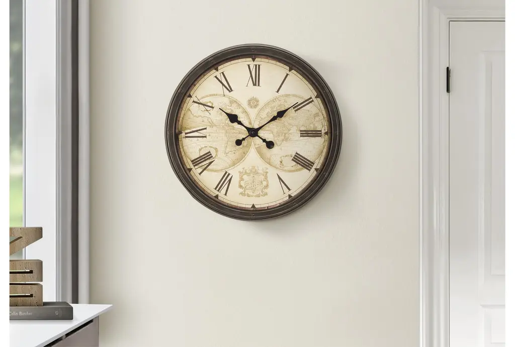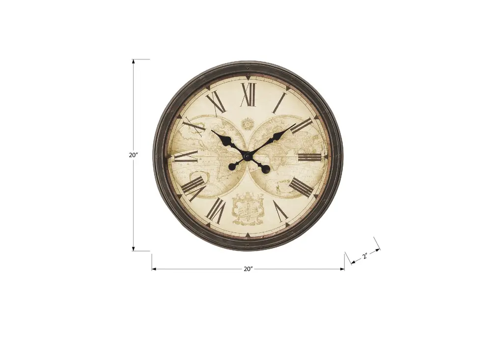 This stylish and fashionable 20" Round Antique Brown World Map Wall Clock adds a touch of traditional elegance to any room. The analog clock features easy-to-read Roman numeric printed markings against an old-world map background for a decorative touch. Enjoy accurate timekeeping without the distracting ticking noise, thanks to the non-ticking quartz movement design of this clock.