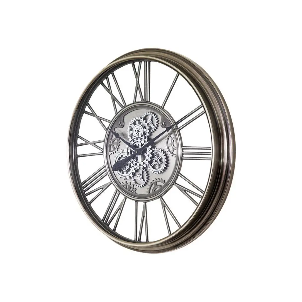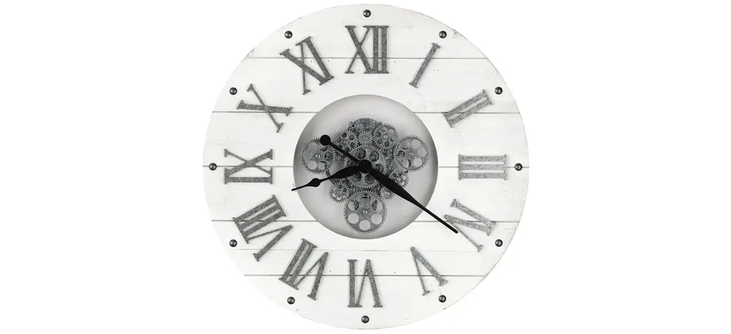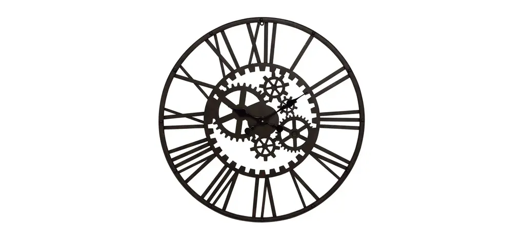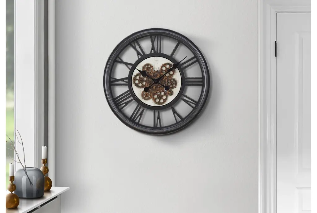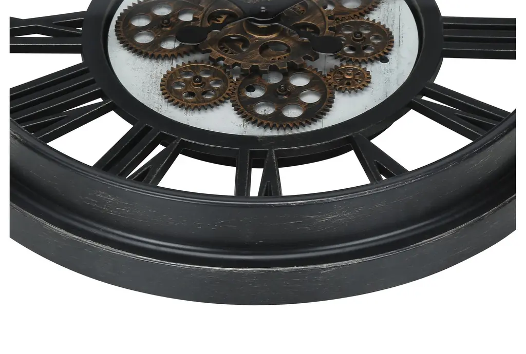 This stylish and fashionable 20" Round Black Gear Mechanism Wall Clock is a perfect addition to any traditional decor. The strong and durable black plastic frame with a glass surface and bronze metal moving gears against a white printed backdrop brings a modern, industrial element to your space. The easy-to-read Roman numeric markings against a skeleton-style background, classic black metal hands, and a non-ticking quartz movement ensure accurate timekeeping.