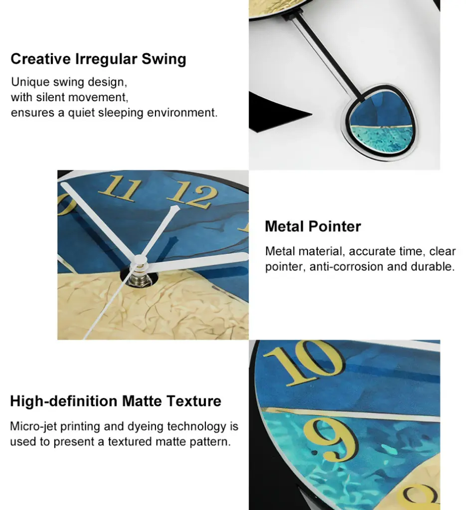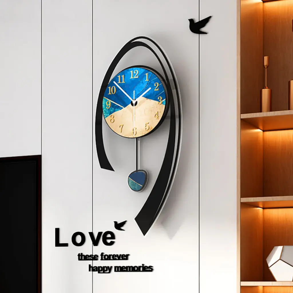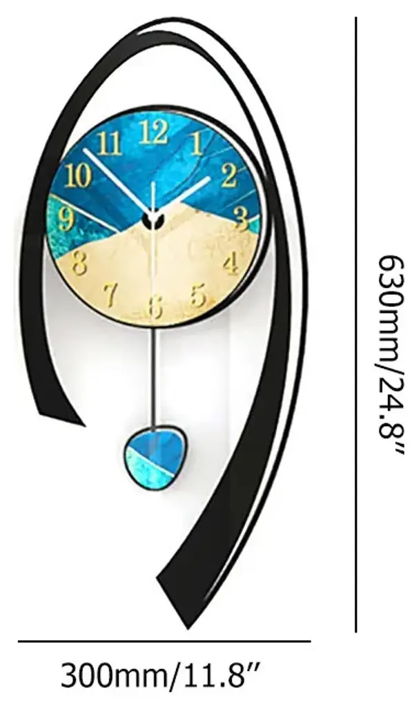 The wall clock is made of acrylic, which shows crystal transparency and 90 percent transmittance. Bringing a modern light luxury style to your place, this clock works properly and accurately without noise. A unique combination of environmental material and creative design, this fashionable wall clock is an excellent ornament for your home wall. - Material: Acrylic- Finish/Color: Multi-color- Overall Dimensions: 11.8"W x 24.8"H (300mmW x 630mmH)- Location: Indoor Use- Time Display: Arabic Number- Batteries Included: No• After installing the battery, pls manually give the pendulum a force to make it swing left and right, and then the pendulum will generate a magnetic pole so that it will continue to swing. Warmly remind that, pls adjust the vertical direction of the hook to avoid friction between the pendulum and other parts of the clock shelf, otherwise it will waste electricity and reduce the swing time.