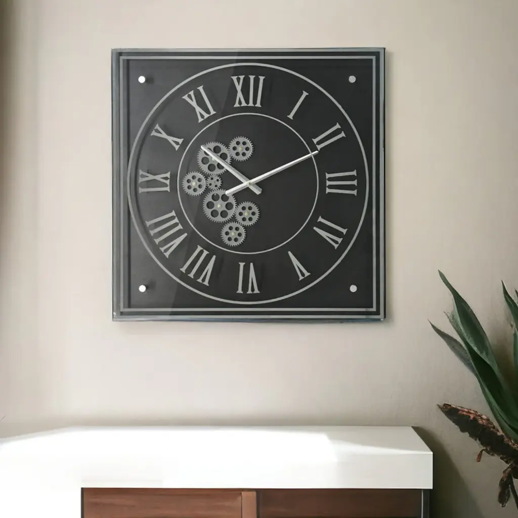 When it comes to subtle sophistication, this Vintage Style Gears Black and Silver Square Wall Clock is sure to make the cut. The piece has a modern industrial/vintage inspired square design with a matte black face accented by gray/silver toned roman numerals, clock hands, and intricately detailed gears. With its fashion-forward palette and classic yet contemporary design, this wall clock will look great on the walls of your home or office. 24-inch H x 24-inch W x 2.4-inch D