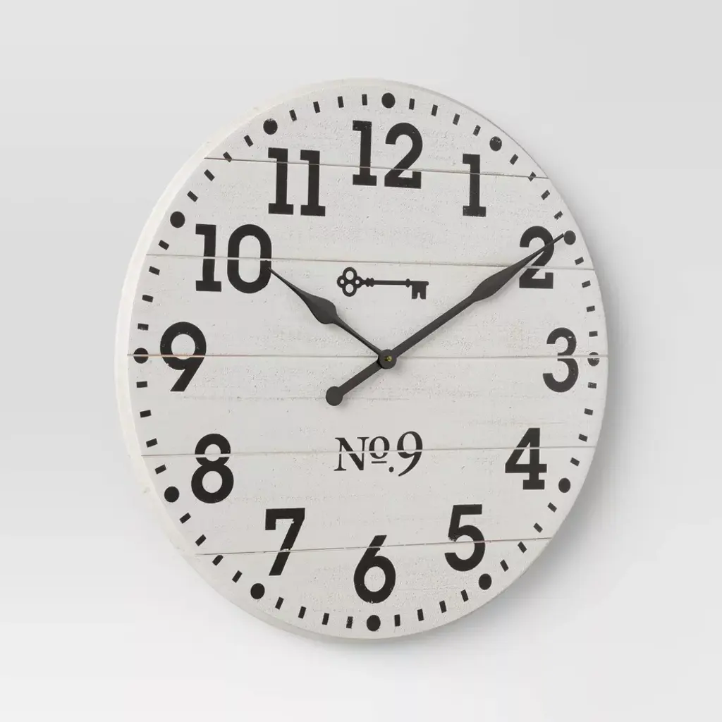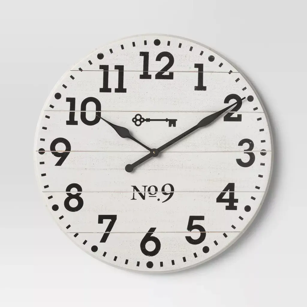 Keep track of time while adding rustic charm to your interiors with the Farmhouse Wood Wall Clock from Threshold™. This decorative wall clock features a slatted design with clear, black numerals on a white background to make it easy to read the time. Sporting a round silhouette, this analog wall clock features a slightly weathered design that adds a homey touch to your space, making it a functional accent piece for your conversation nook, entryway, kitchen or any other wall in your home.Threshold™: Quality & Design / Casual classics for house and home.