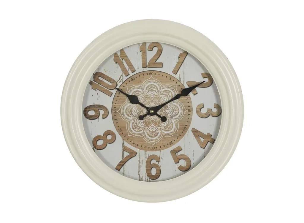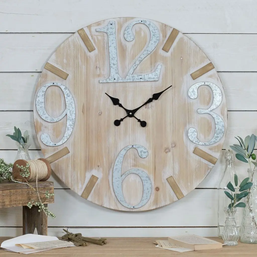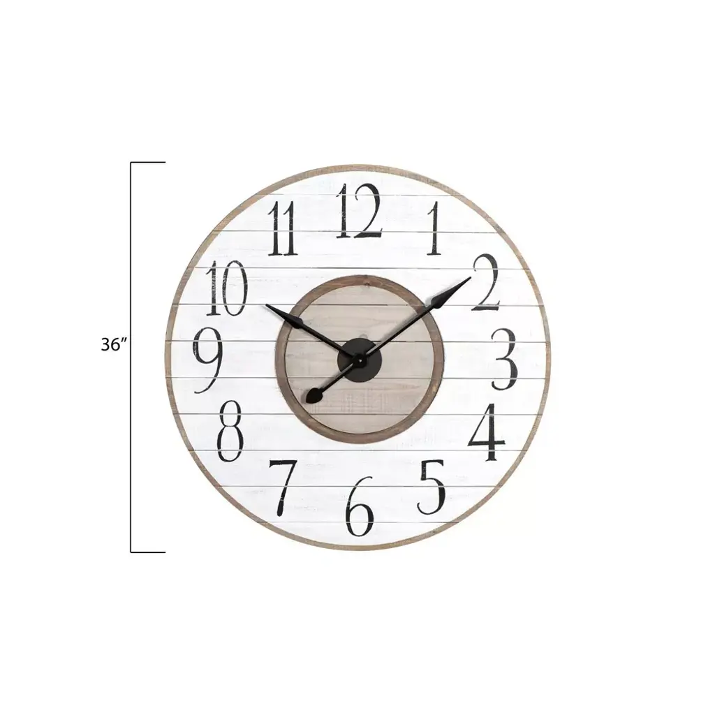 Add a touch of warmth and charm to the home with this round wood slat wall clock. This rustic clock features a two-tone slatted wood construction, giving it a unique and textured look. The clock face has black numerals and hands contrasting with the white and brown backgrounds. The clock has a playfully designed movement that adds some flair and personality. The clock requires one AA battery (not included) to operate. It has a quartz movement that ensures accurate timekeeping and a gentle ticking sound. The clock measures 36 inches in length, 2.25 inches in width, and 36 inches in height. This wall clock is a perfect gift for the self or someone special who loves rustic and cozy items. Whether it is a touch of sophistication to the home or impress the guests with exquisite taste, this clock is the perfect choice.