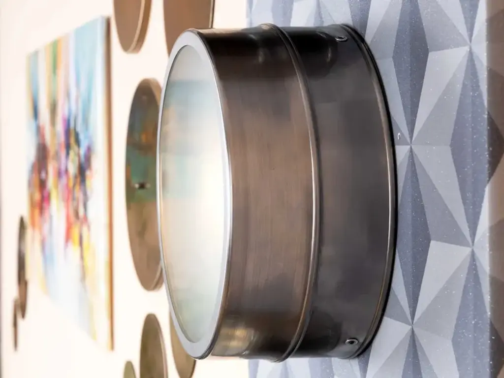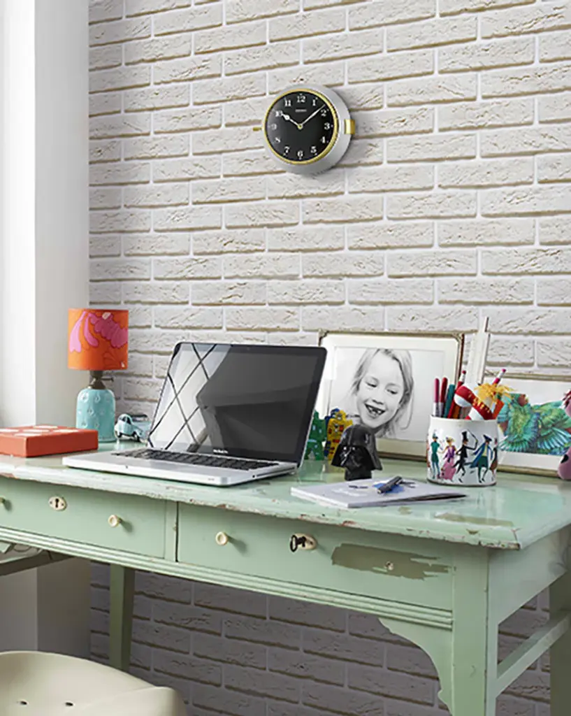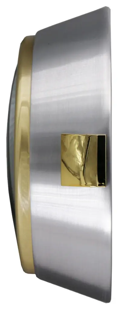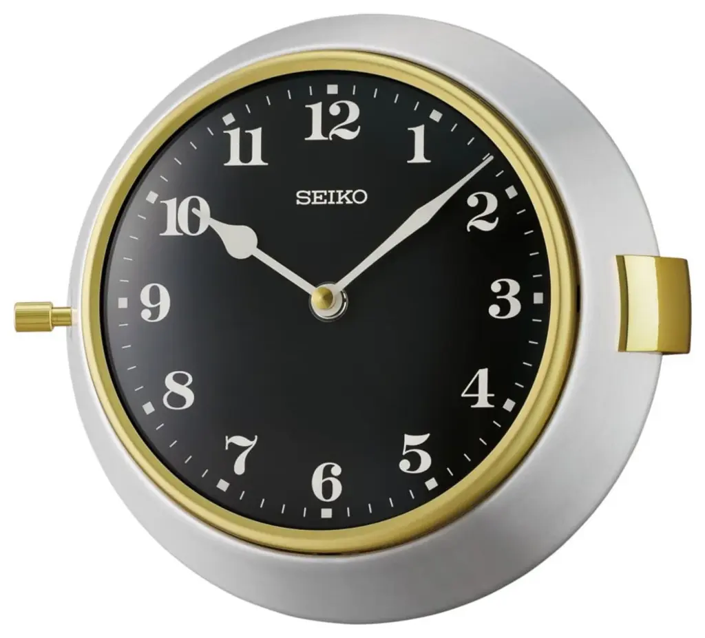 Ahoy matey! Inspired by a traditional porthole, this circular window clock will add charm to any space. It features an aluminum case with golden accents.