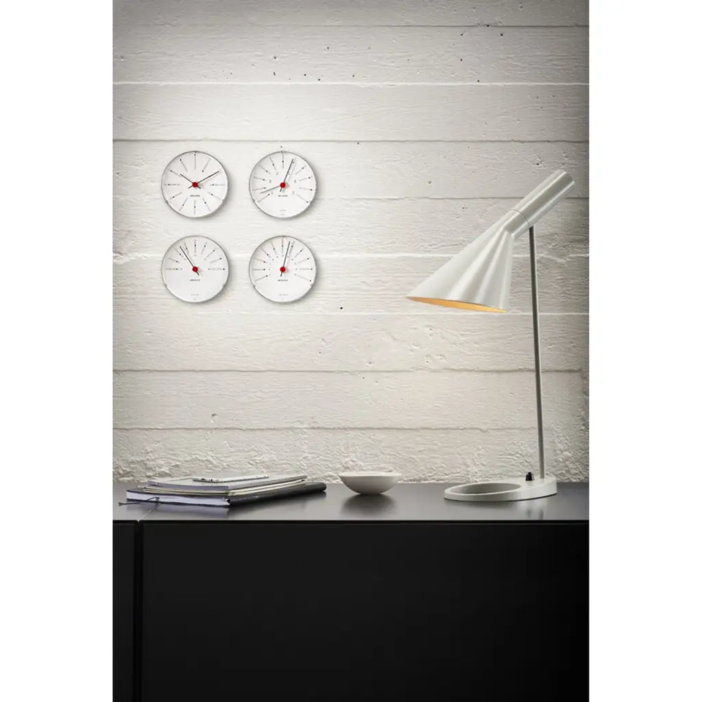 The minimalist AJ Bankers hygrometer features a monochrome dial with numerals, small colored squares, black hands, convex glass front and a red detail in the middle. The special aluminum case gives the barometer a floating appearance when mounted on the wall. Build a beautiful weather station with the AJ Bankers wall clock, thermometer, hygrometer and barometer. Architect and designer Arne Jacobsen designed the Bankers Clock for the National Bank of Denmark in 1971. To ensure the Bankers collection’s authentic design, Rosendahl Design Group has worked in close collaboration with Teit Weylandt, the former head of the product development division at Arne Jacobsen’s studio.