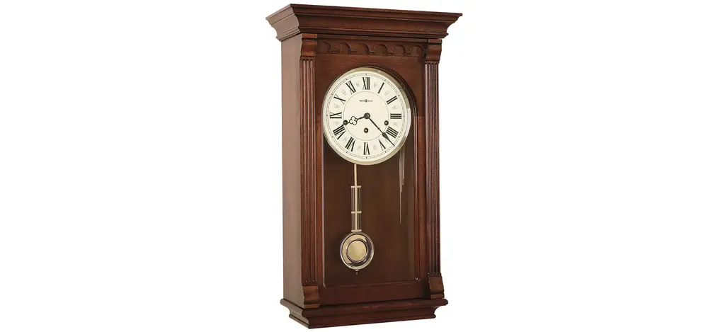 This Alcott Wall Clock features a cherry finish on select hardwoods and veneers. This clock features a polished and raised brass-finished pendulum with grid and key-wound single-chime movement. An industry exclusive dual ratchet winding arbor ensures safe movement winding. Chime silence option and durable bronze bushings.