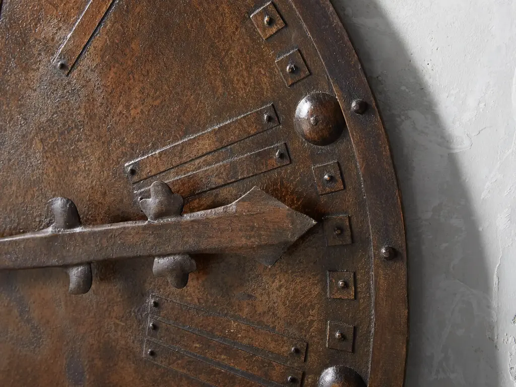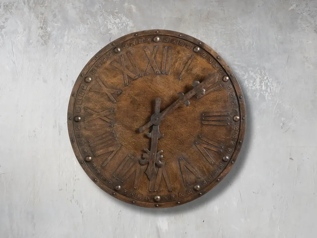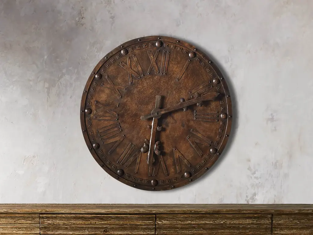 Reminiscent of large clocks in railway stations or atop clock towers, this iron faux timepiece exudes a sense of dramatic grandeur. Crafted by Indian artisans using solid iron. Hand-finished with a rustic, distressed patina. Adjustable metal hands. Not a functional clock.