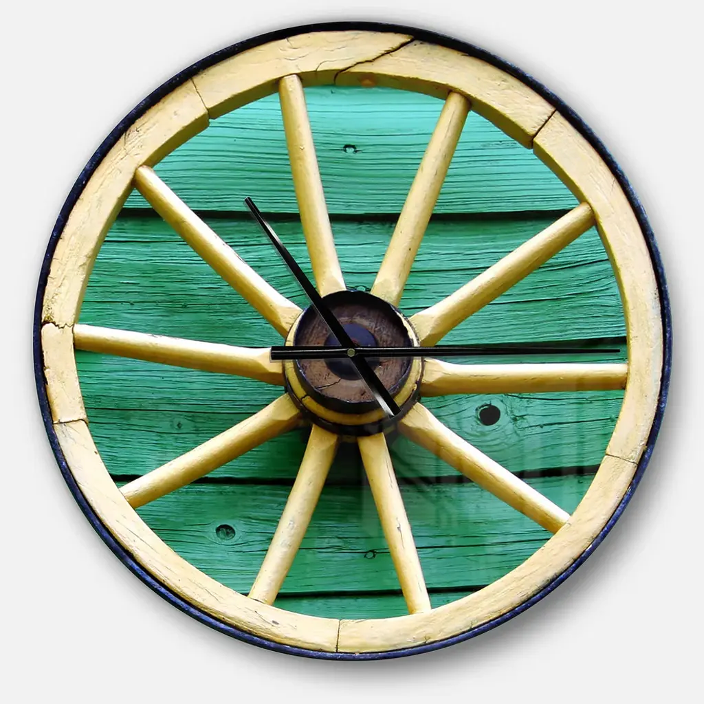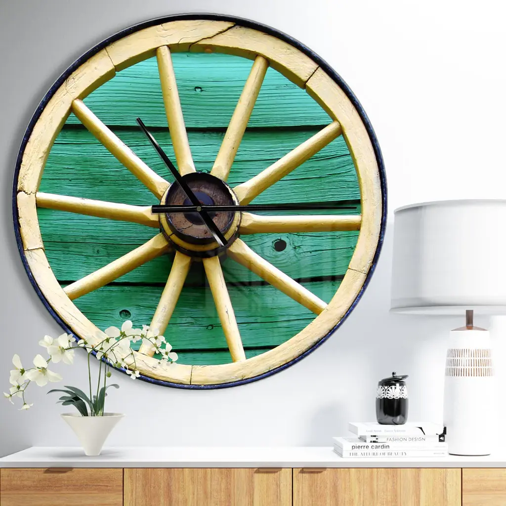 A beautiful addition to any home or office, this Farmhouse round wall clock is made on 100% solid aluminum. It has a highly reflective glossy finish creating a sleek modern look. This Antique Wagon Wheel on Turquoise Wood wall clock arrives completely ready to hang on the wall. Simply insert the �AAA� battery included with your order.Available in several size, this Modern Oversized Clock makes it the focal point of any room.Features - Ultra Gloss Coating ensures colors are extra vibrant with light reflection. - 1mm Aluminum grade sheet metal. - 1-inch mounting frame gives the illusion of artwork floating on the wall. - Mounting brackets and instructions are included. - High quality digital images are created directly into a glossy aluminum panel, producing a stunning and captivating print in the glossy finish of the metal. - Looks better than any photo paper and guaranteed to last at least 20 years. - Easy to clean with a microfiber cloth. - "AAA" battery included with your order. - Easy to hang. - Style: Farmhouse - Material: Metal - Shape: RoundSee Options drop down for available sizes.