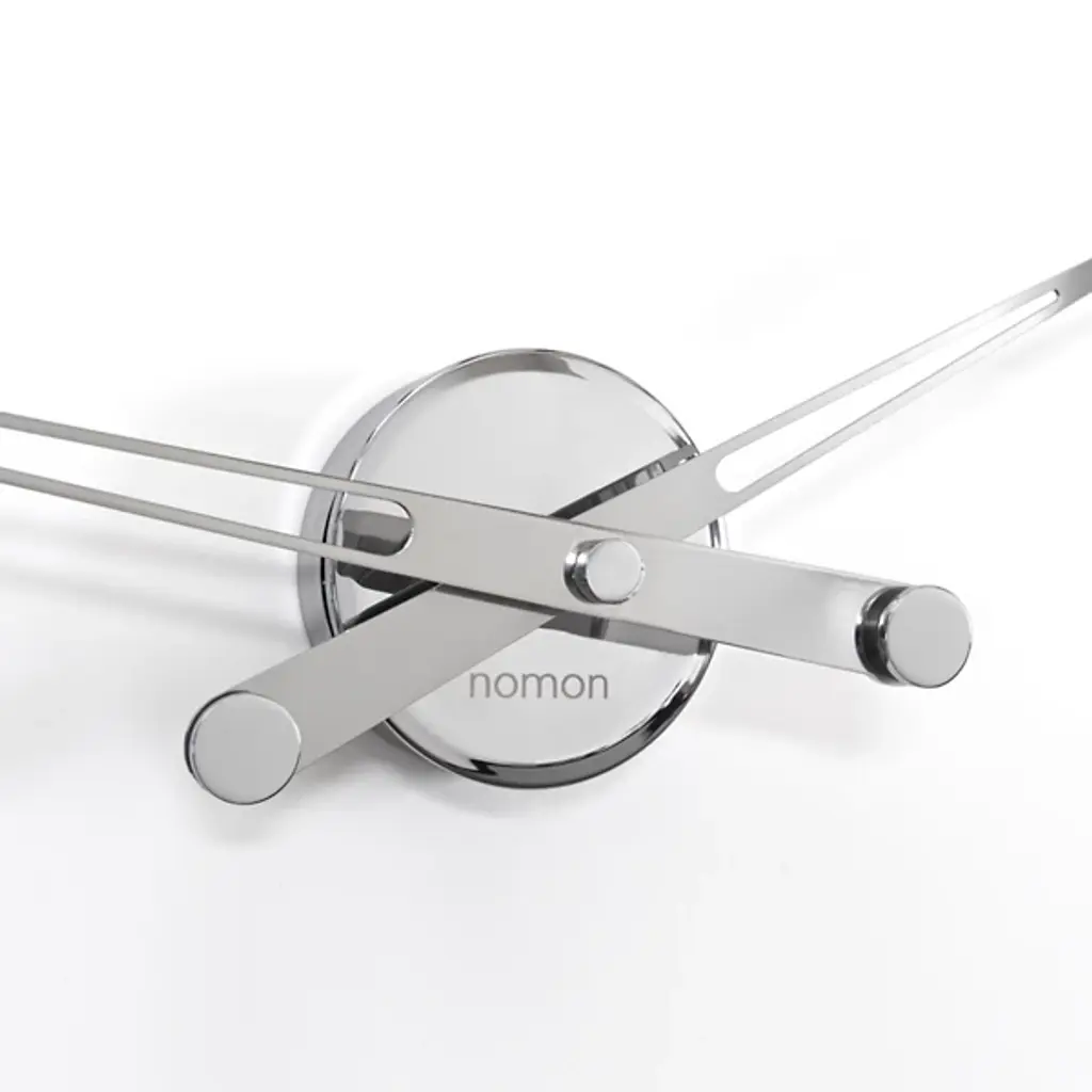 Decorate your wall space with the Axioma Wall Clock from Nomon. A simple yet functional design that can easily enhance an area and add a minimal feel. Features a beautiful chrome or polished brass center piece box with the choice of wooden or steel elongated hands.